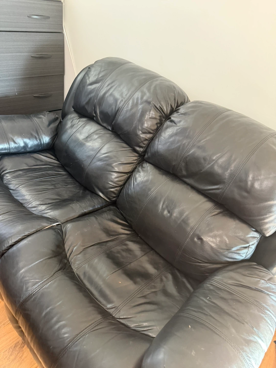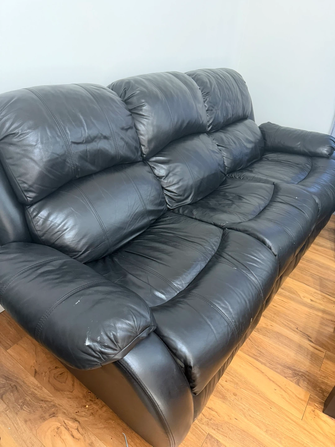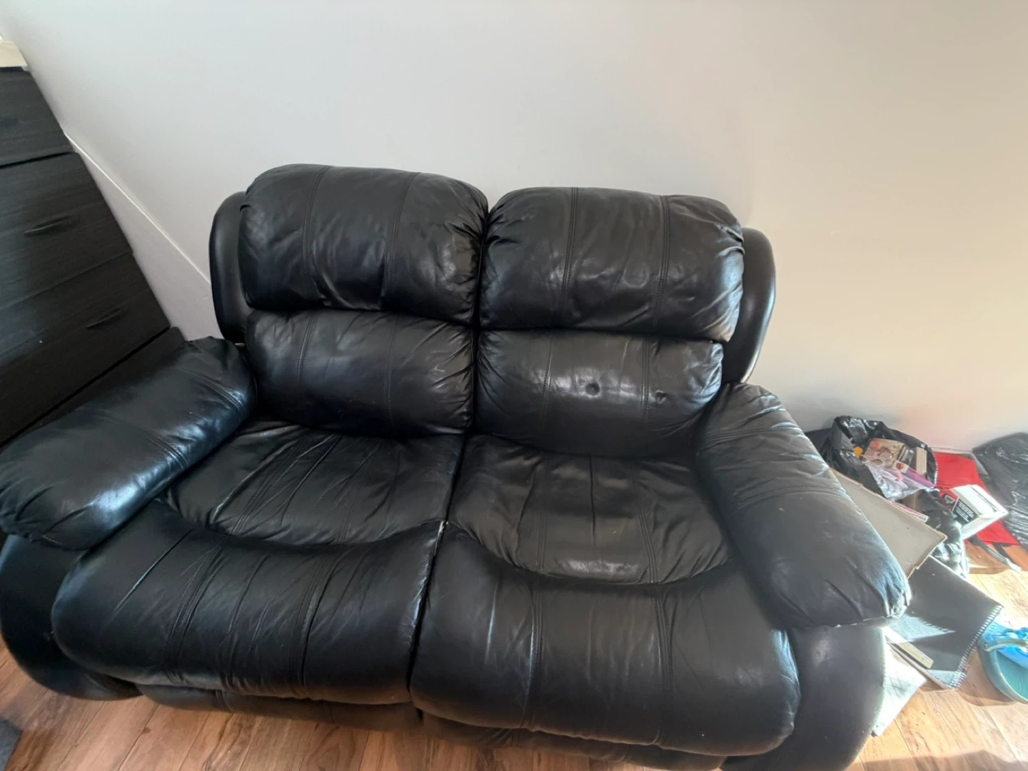 Black leather reclining sofa, seats three. Plush cushions for comfort. Perfect for a living room or family room! Moving out sale