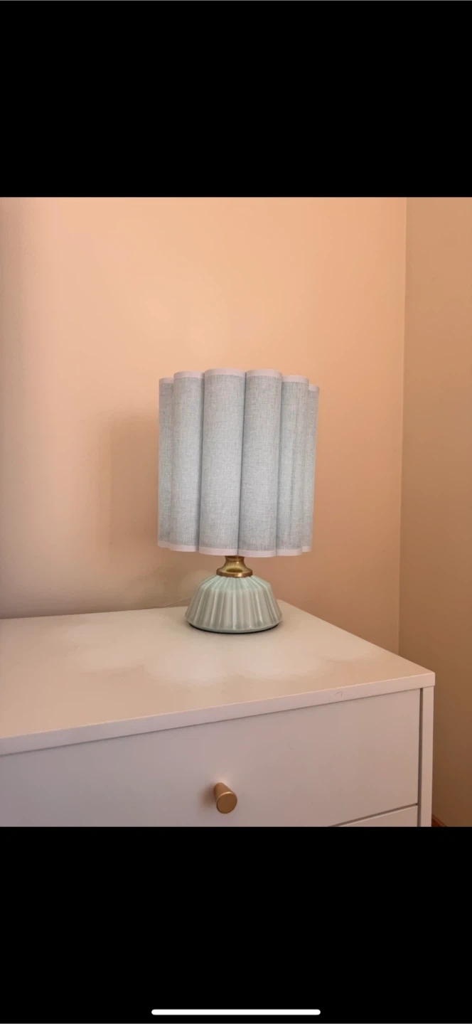 Cute table lamp with a pastel blue ceramic base and a light blue pleated fabric shade. It's a nice accent piece for a bedroom or living room.