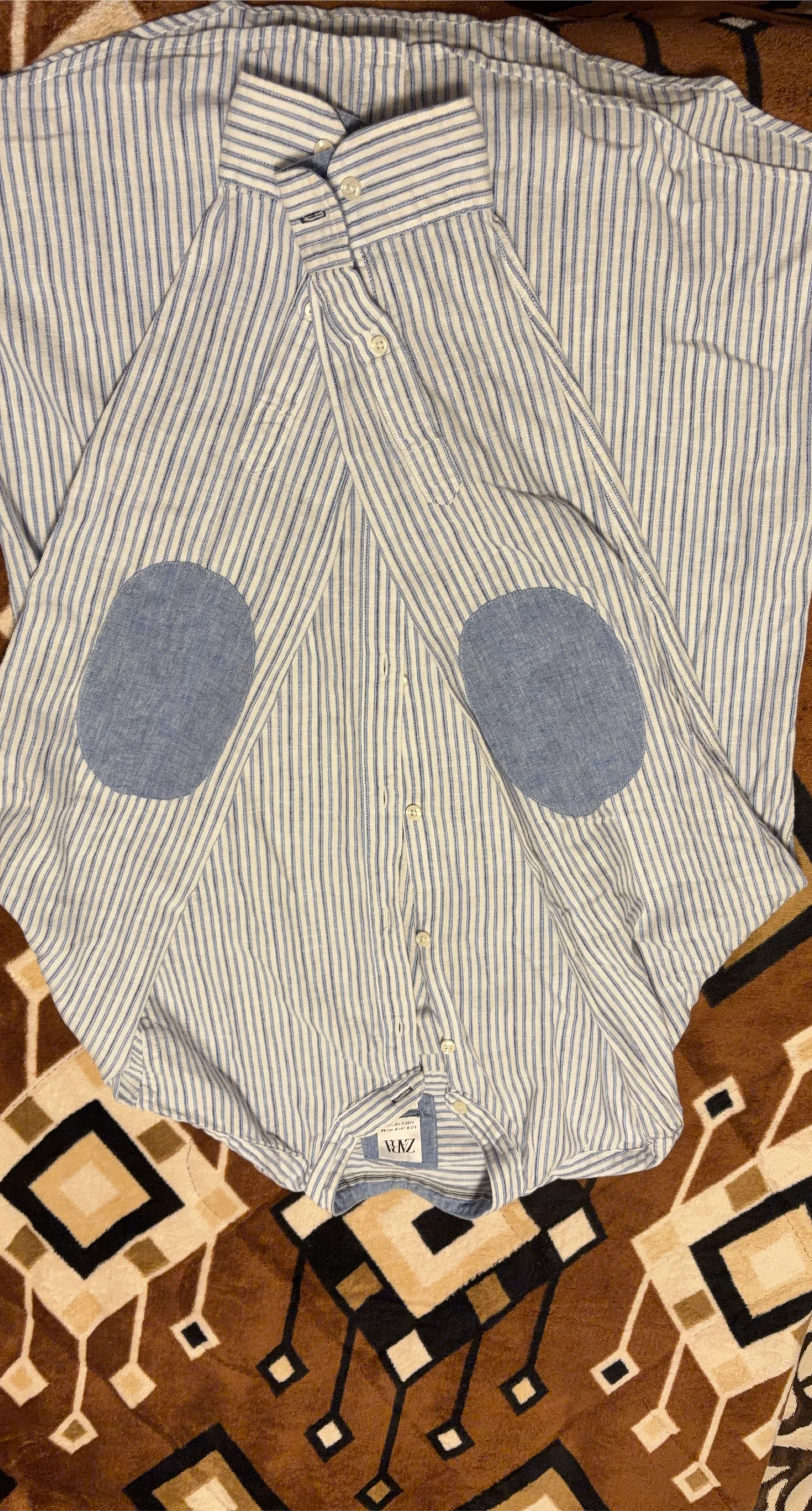 This is a men's long-sleeved button-up shirt. It's blue and white striped with contrasting blue elbow patches. The fabric appears to be a linen blend, making it lightweight. The shirt is a size medium.