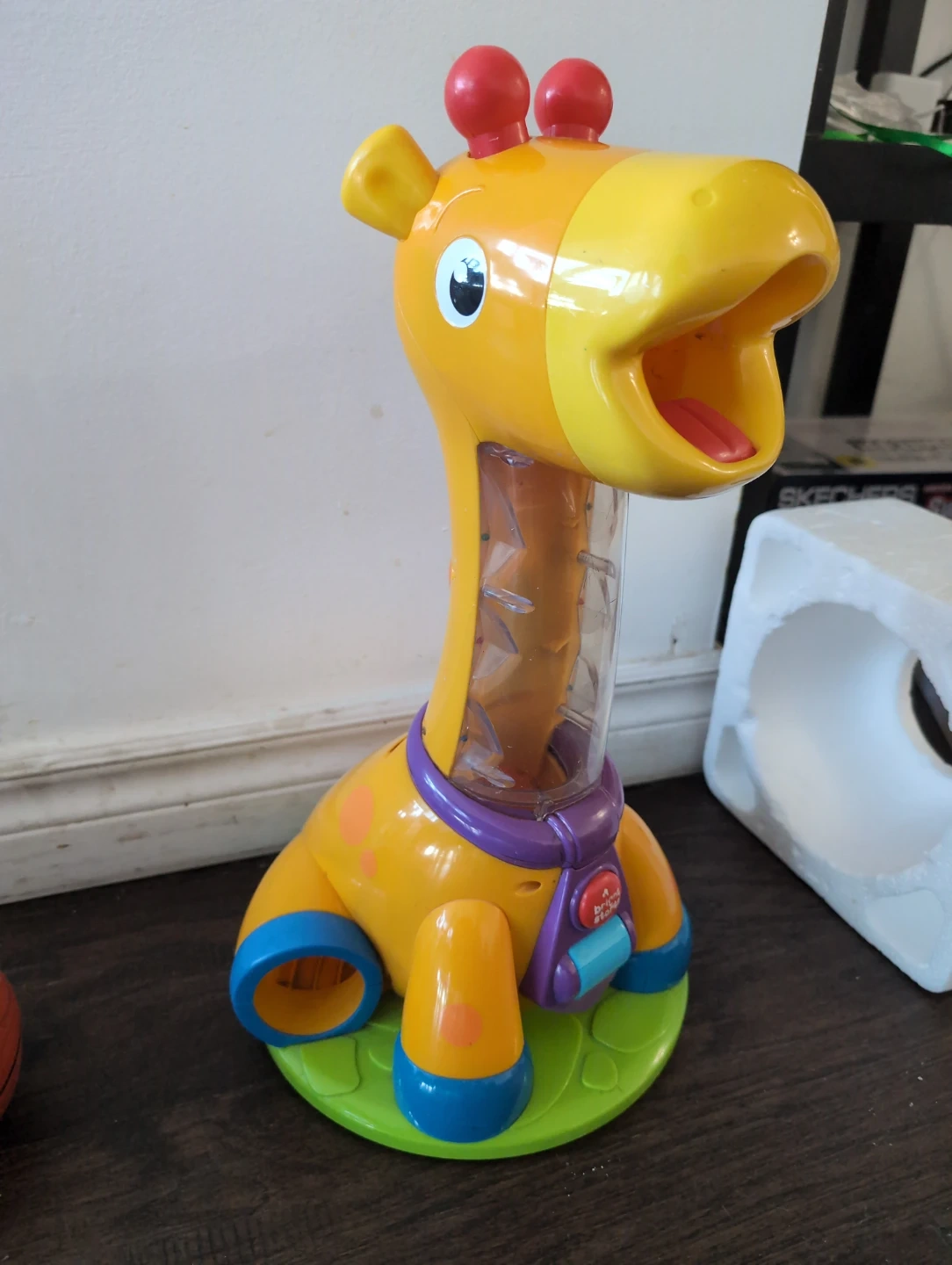 This Bright Starts Grab & Spin Giraffe toy is bright yellow with purple, blue, and green accents. It's designed for little ones to interact with. The neck features a clear tube with spinning elements inside.