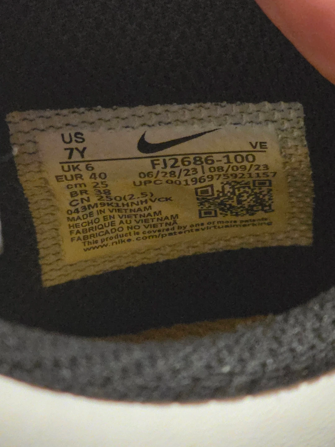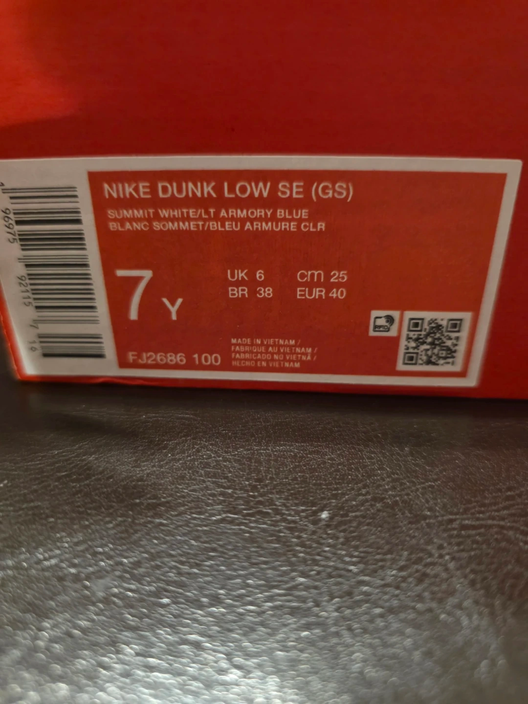 These are Nike Dunk Low SE GS sneakers in a "Summit White/Lt Armory Blue" colorway. Includes original box. Size 7 in Youth UK 6, EUR 40, CM 25.