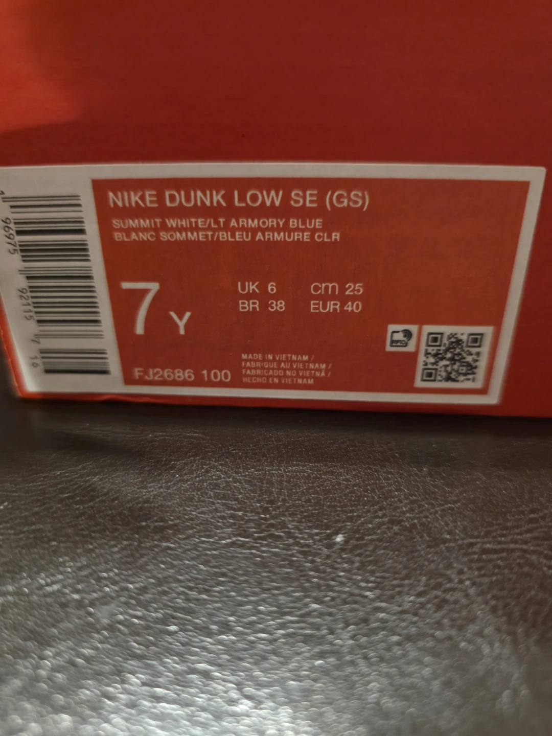 These are Nike Dunk Low SE GS sneakers in a "Summit White/Lt Armory Blue" colorway. Includes original box. Size 7 in Youth UK 6, EUR 40, CM 25.