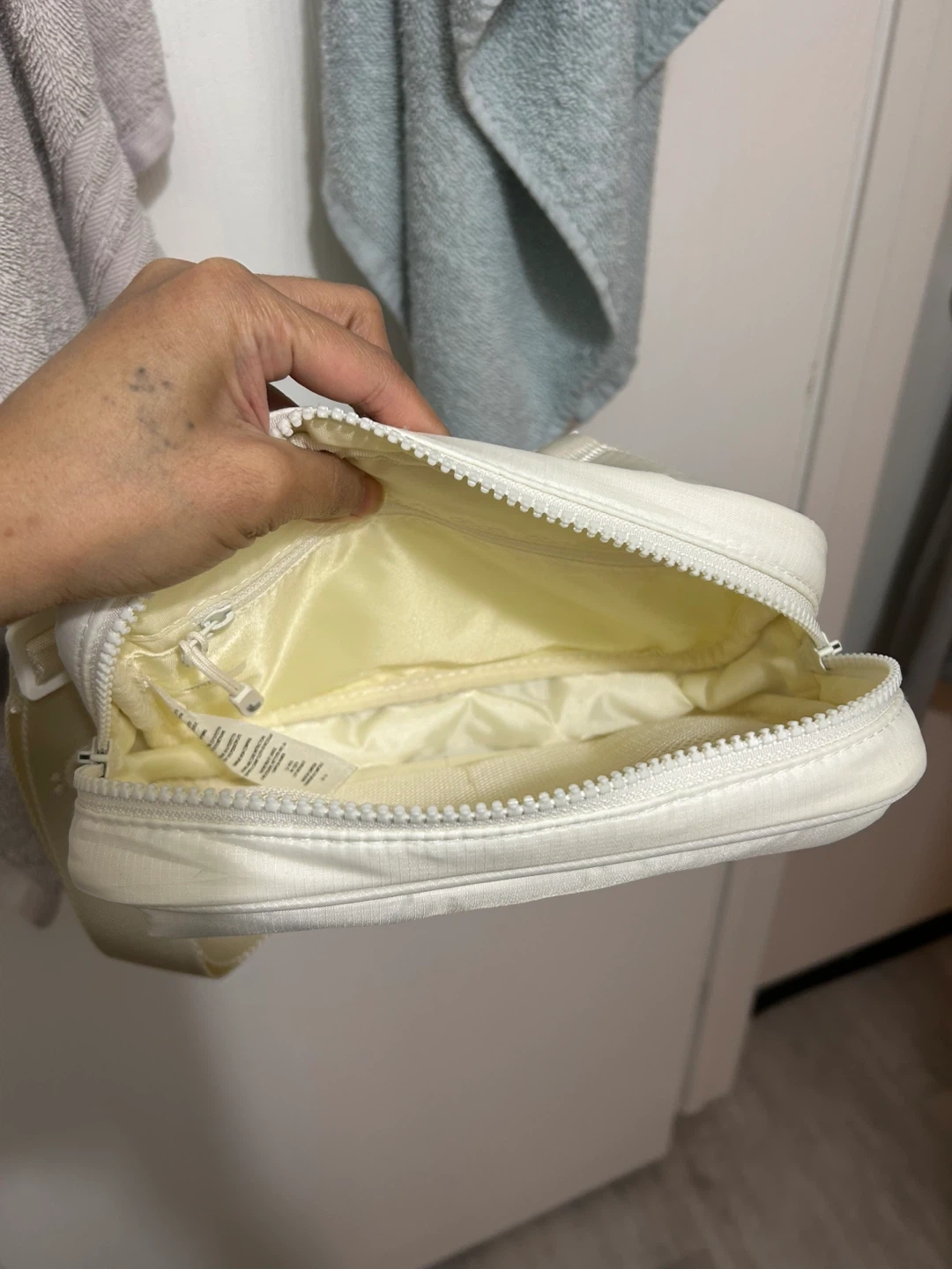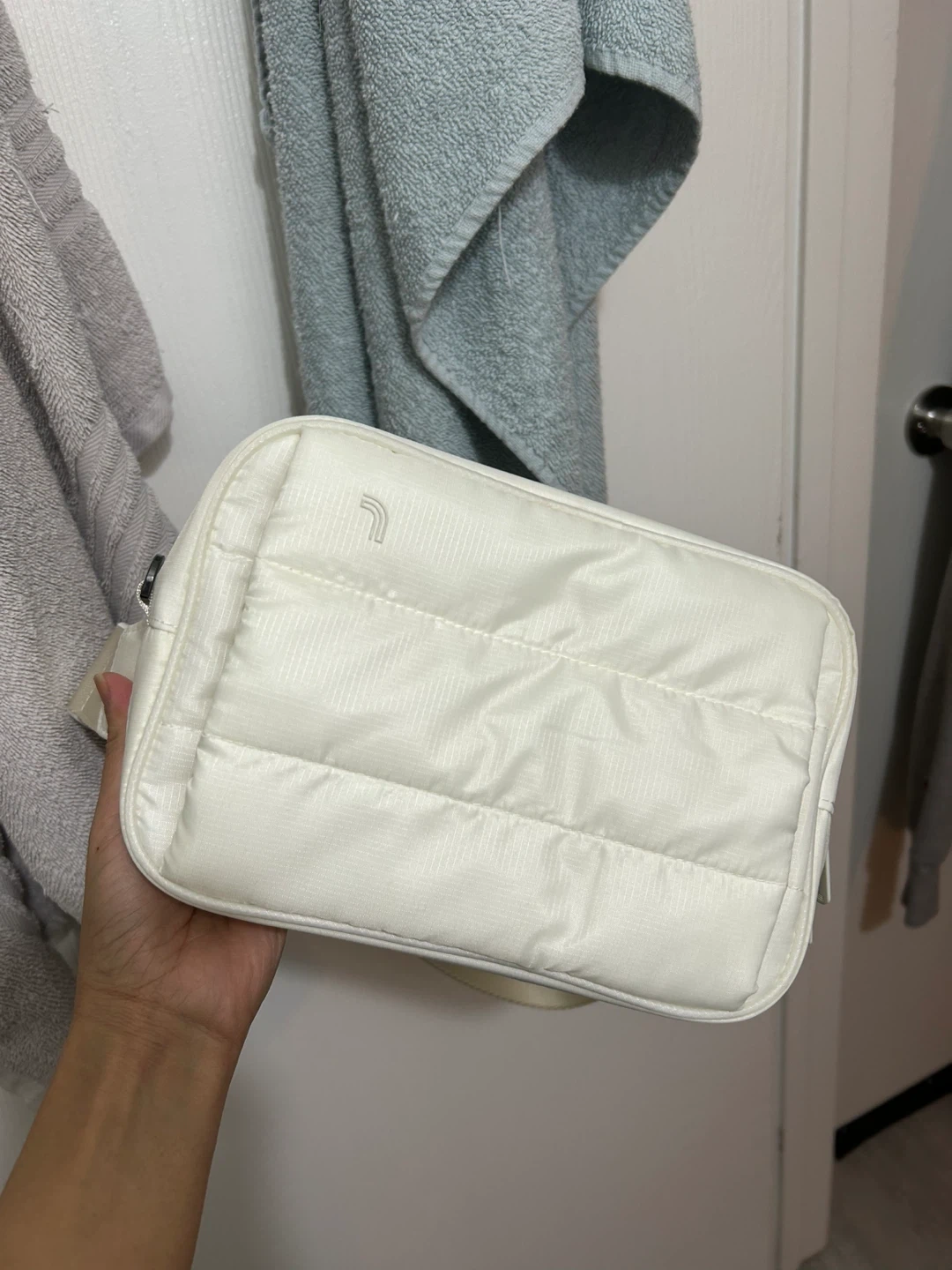 Lole white quilted puffer bag with a zippered main compartment. It's got a soft, fuzzy interior lining. Features an adjustable strap for comfortable wear.