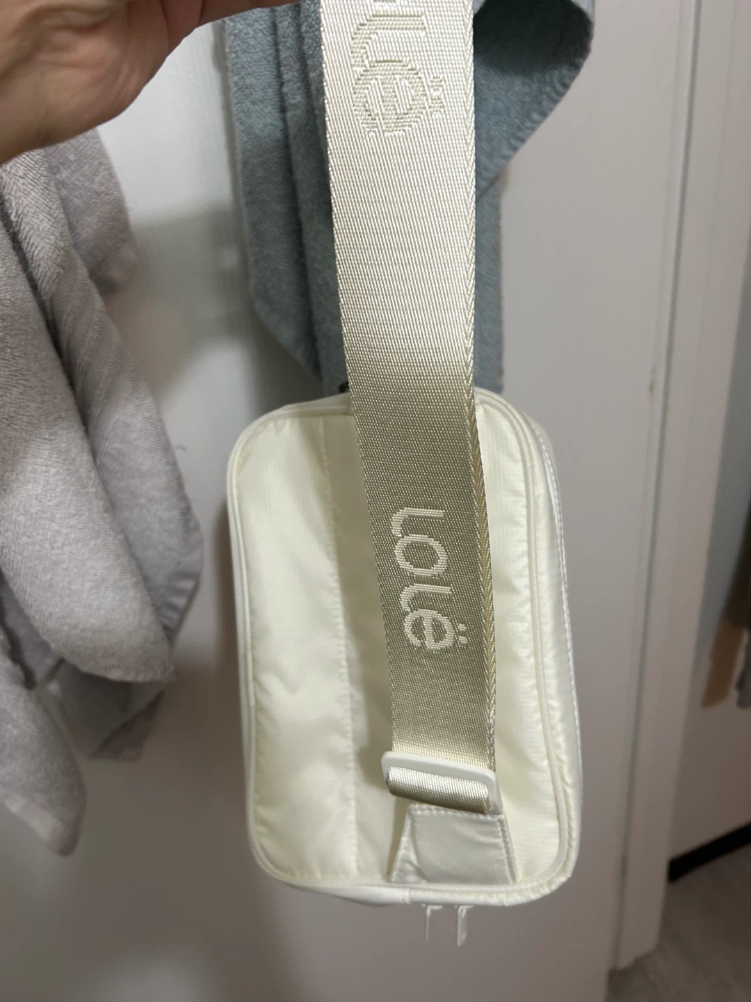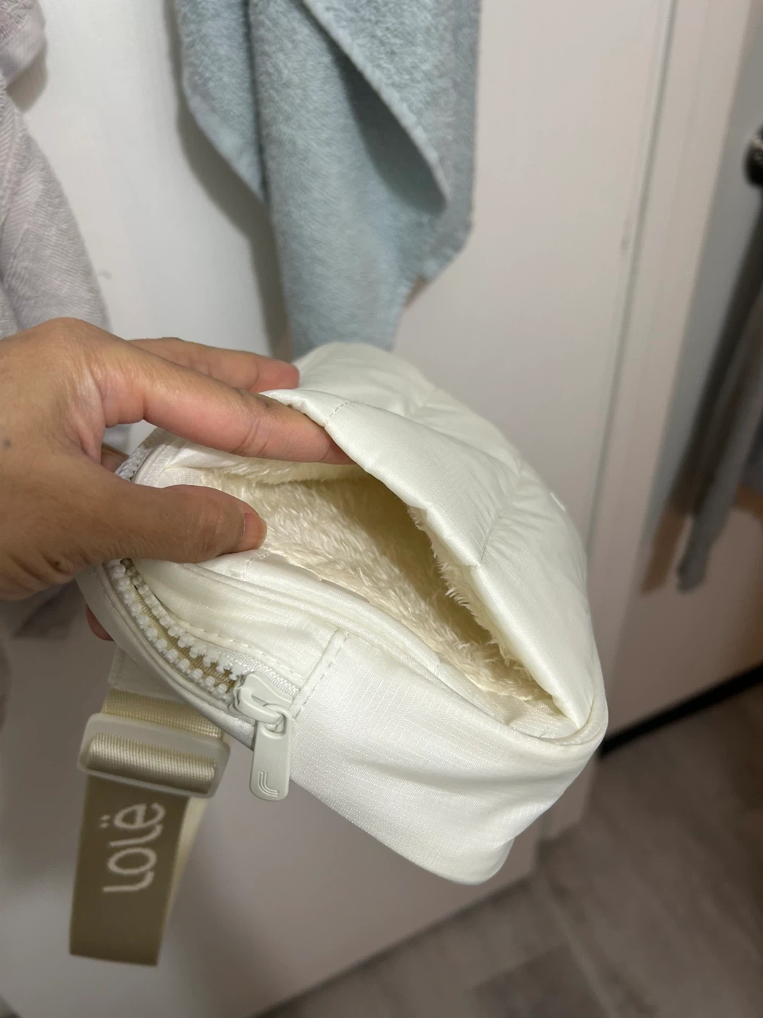 Lole white quilted puffer bag with a zippered main compartment. It's got a soft, fuzzy interior lining. Features an adjustable strap for comfortable wear.