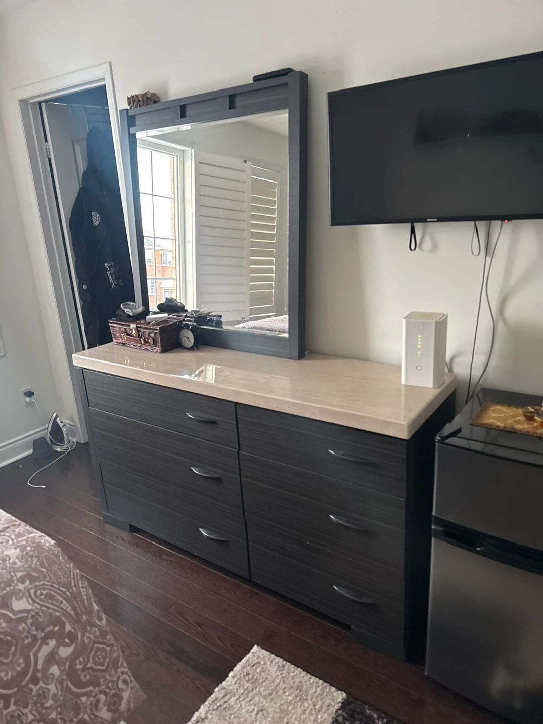This dresser features a dark grey finish with a light beige countertop. It has six spacious drawers for storage and comes with a matching mirror. It's a solid piece for any bedroom!