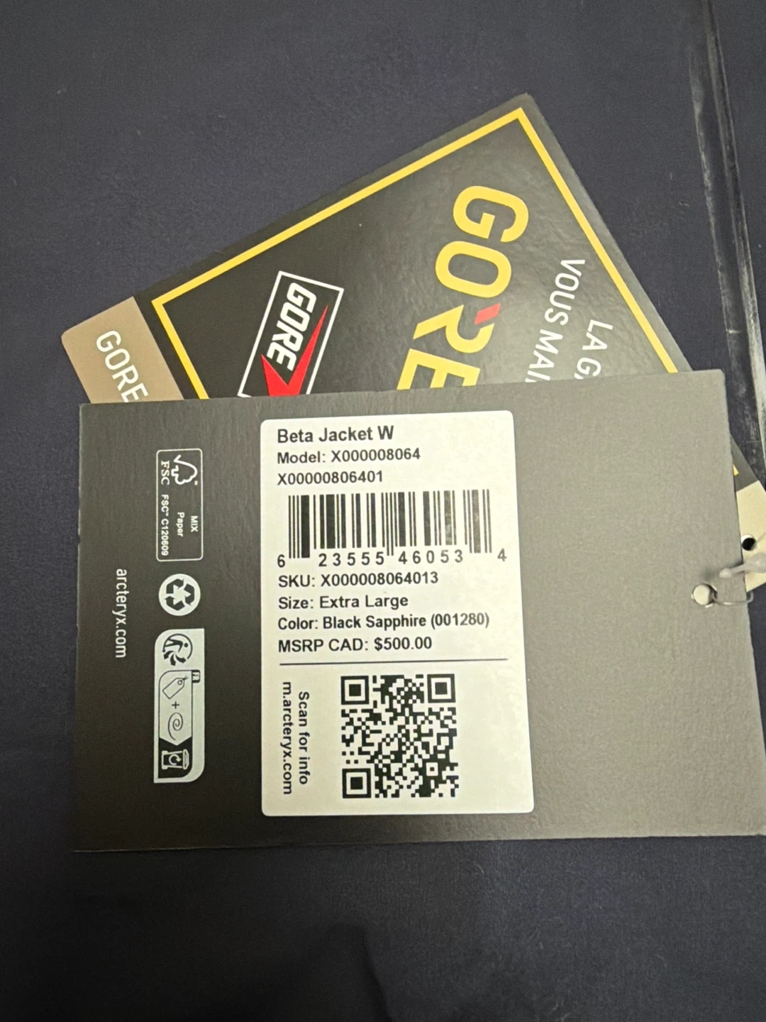 Selling a women's Arc'teryx Beta Jacket in size XL. The colour is Black Sapphire (001280). Originally bought for $500 CAD.