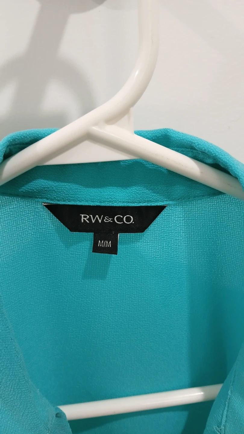 This RW & CO. sleeveless blouse is a vibrant teal colour. It's a size medium. This top has a unique wrap-style front with a single button closure.