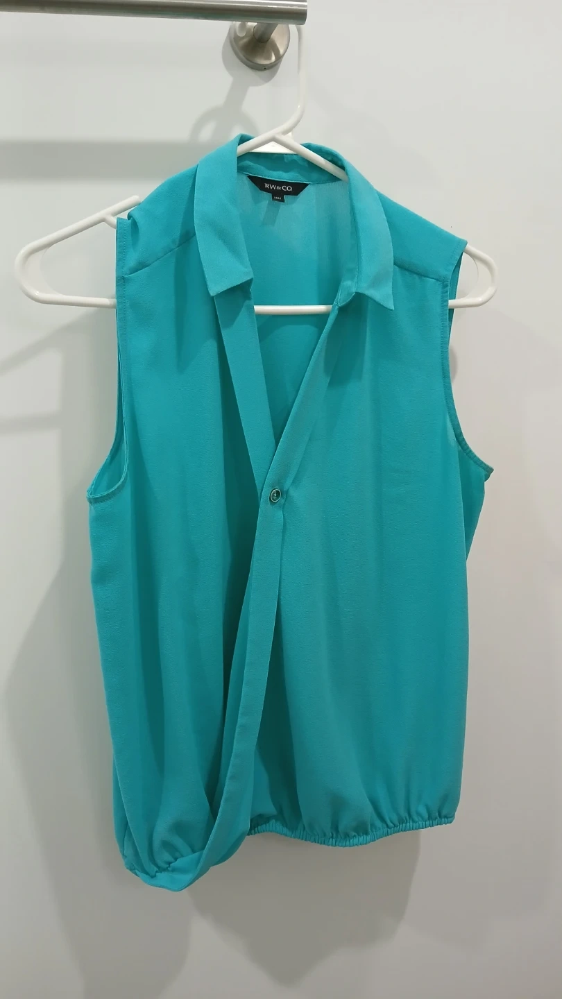 This RW & CO. sleeveless blouse is a vibrant teal colour. It's a size medium. This top has a unique wrap-style front with a single button closure.