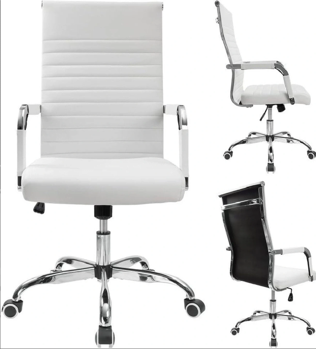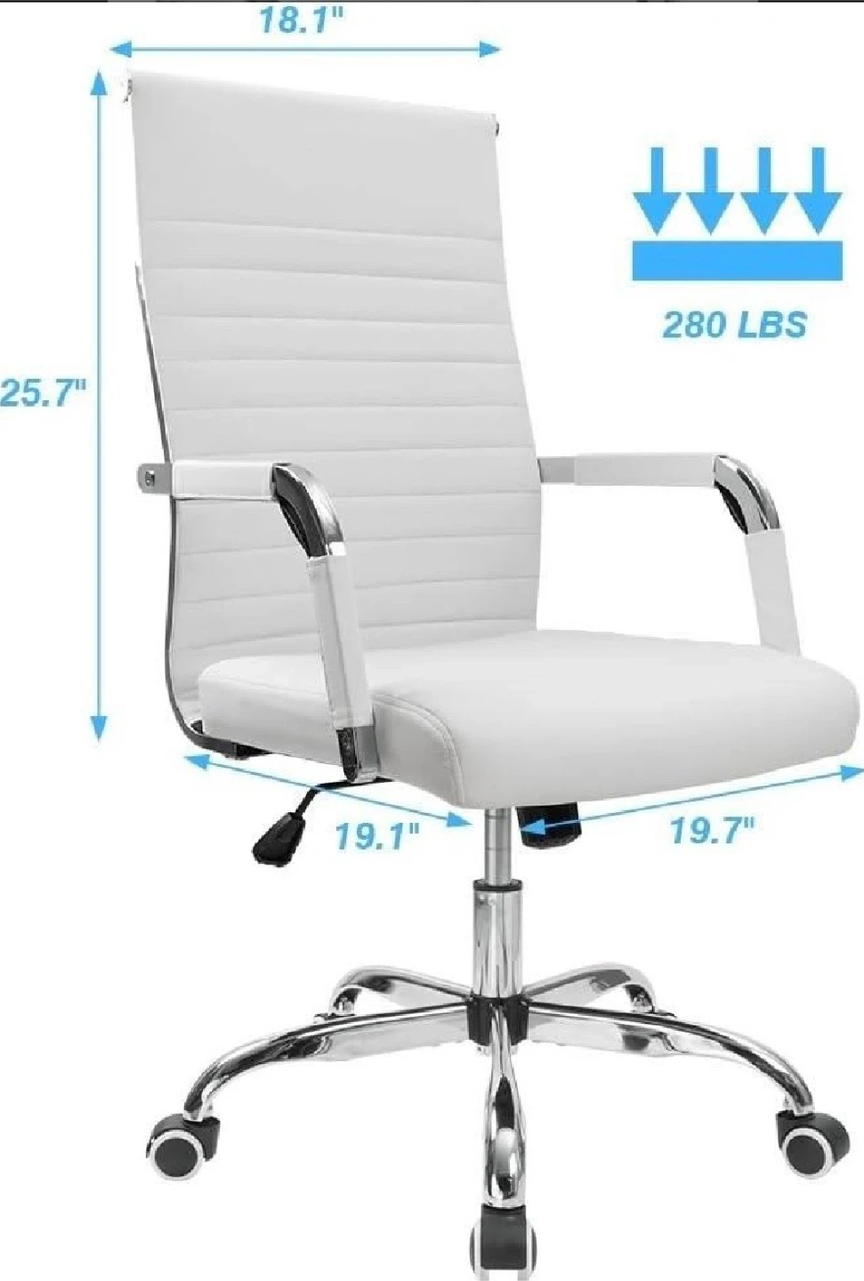 This white office chair offers an adjustable angle from 90° to 120° and a rocking function for comfort. It's designed with a sleek, modern look. Supports up to 280 lbs.