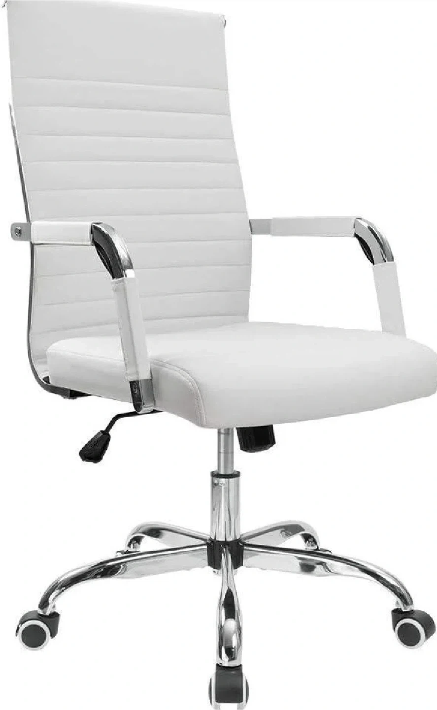 This white office chair offers an adjustable angle from 90° to 120° and a rocking function for comfort. It's designed with a sleek, modern look. Supports up to 280 lbs.