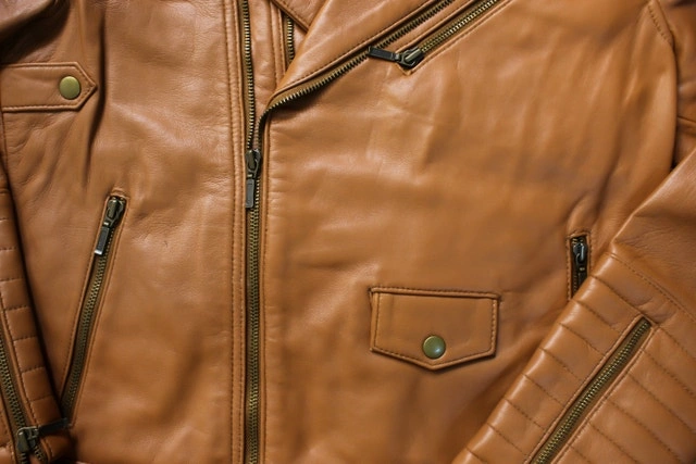 Skinny fit, lined with patterned premium silk. Features a seam-sealed YKK zipper and bronze buttons. Color: Almond Brown. Size: Small. See attached size chart for details. Made from calfskin leather. Care instructions: Wipe or spot clean only. Use leather conditioner to keep moisturized. Dry clean for difficult stains only. Condition: New. For Sale By: Owner. Curbside pick up available. Drop off/Delivery available. Cash accepted.