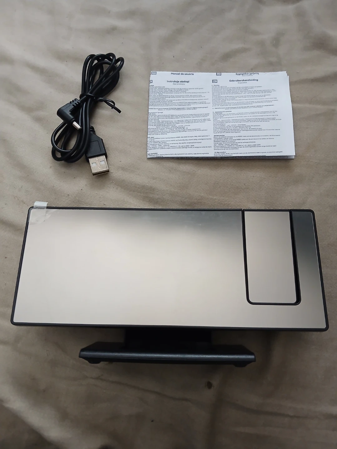 Brand new digital mirror alarm clock. It includes a USB charging cable and instructions. It has multiple function buttons for setting alarms and modes. The clock features a reflective mirror display. It's operating voltage is <36. Cash only. Pick up or meet up in public place.