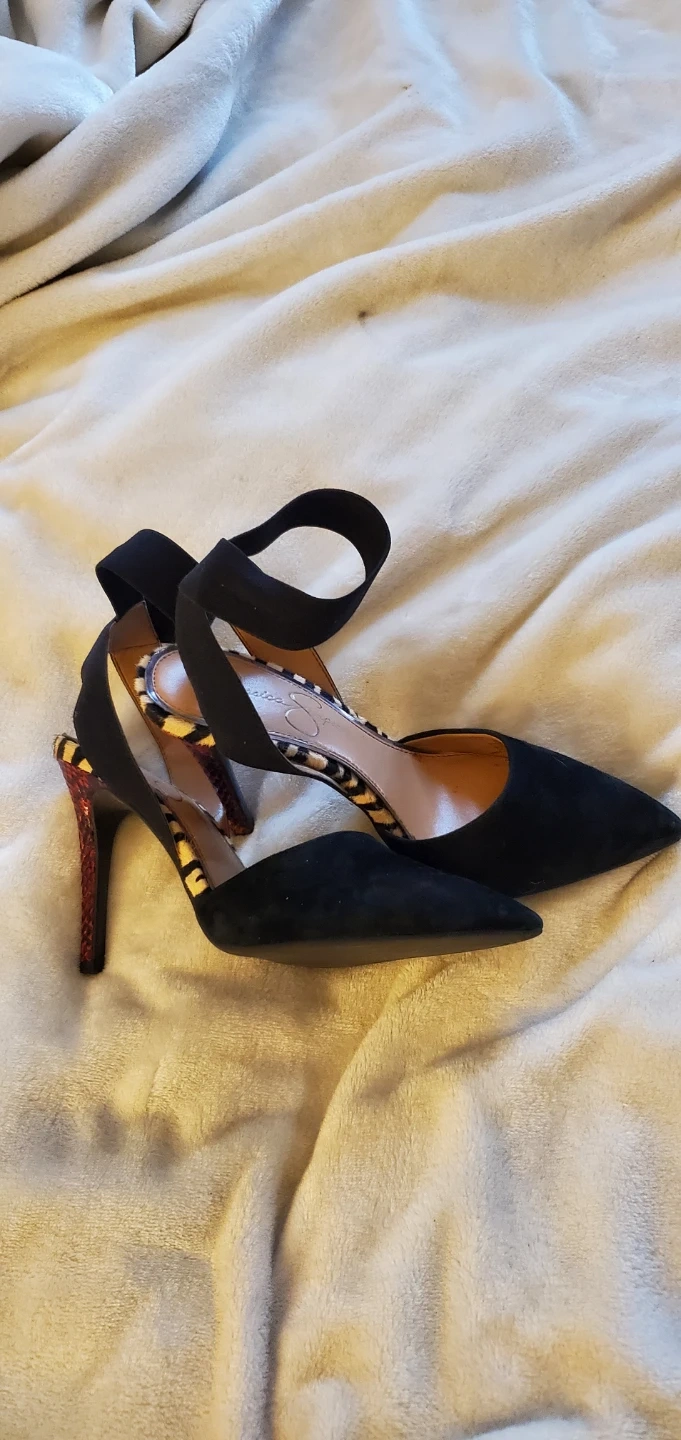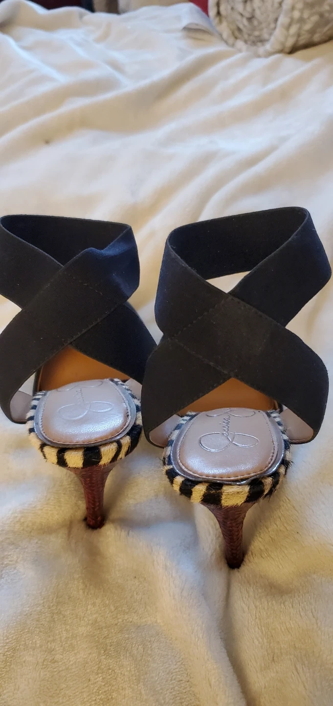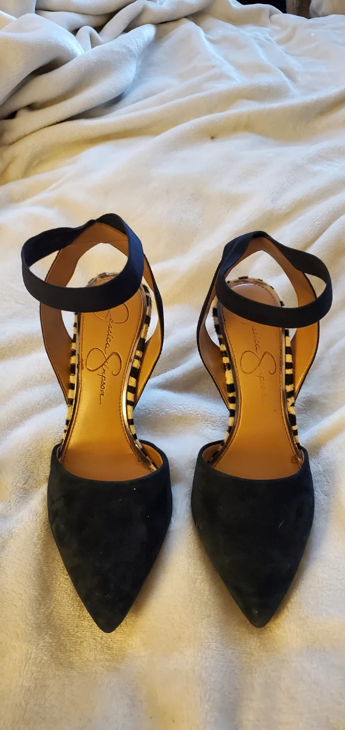 These Jessica Simpson heels are black suede with a fun zebra print accent around the heel. They feature an ankle strap for a secure fit. Size is 6 1/2
