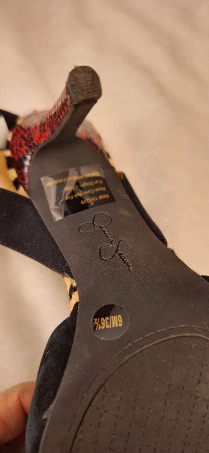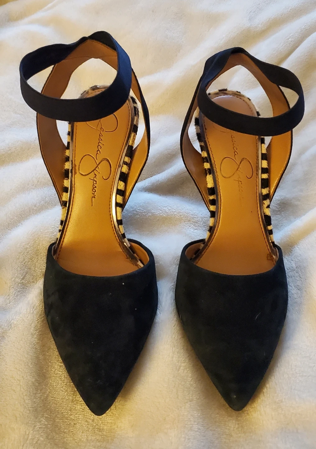 These Jessica Simpson heels are black suede with a fun zebra print accent around the heel. They feature an ankle strap for a secure fit. Size is 6 1/2