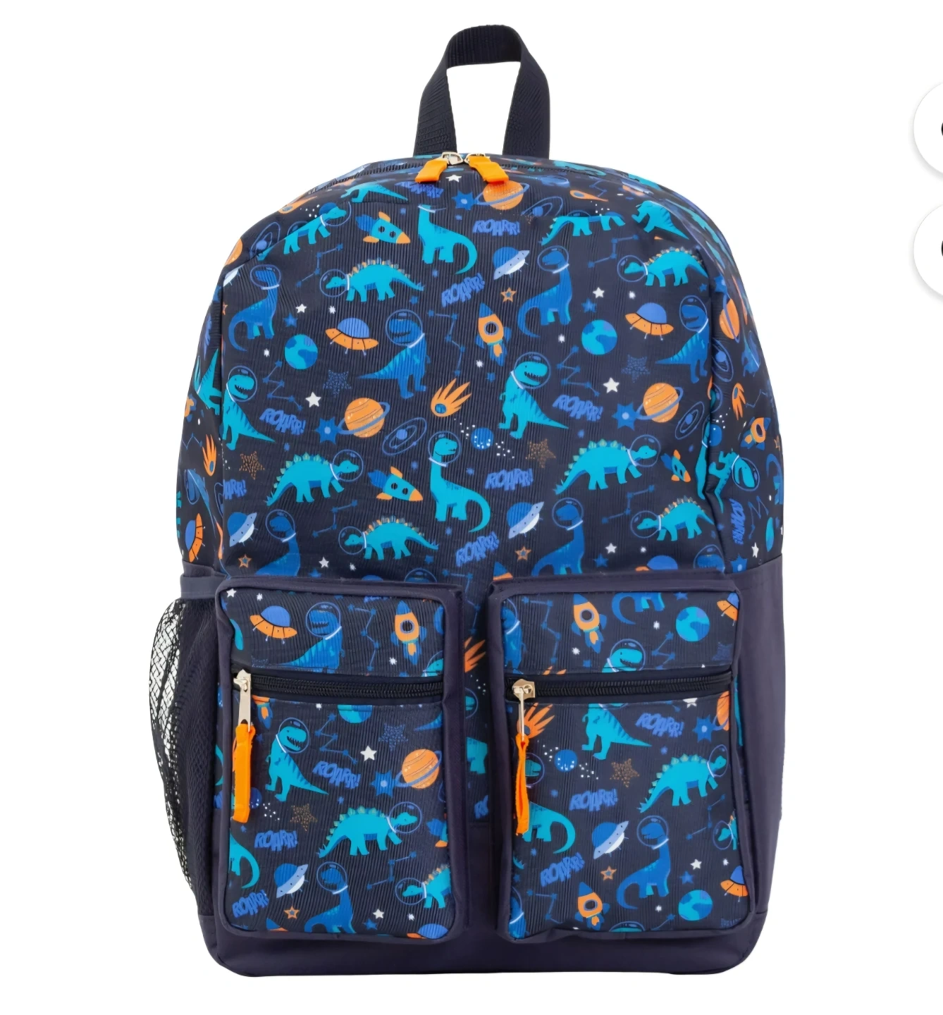 This navy backpack features a fun all-over print of dinosaurs in space, complete with planets and rockets. It's 16 inches tall, 11 inches wide, and 6.5 inches deep. It has multiple zippered pockets and mesh side pockets for water bottles. Roar-some for school adventures!