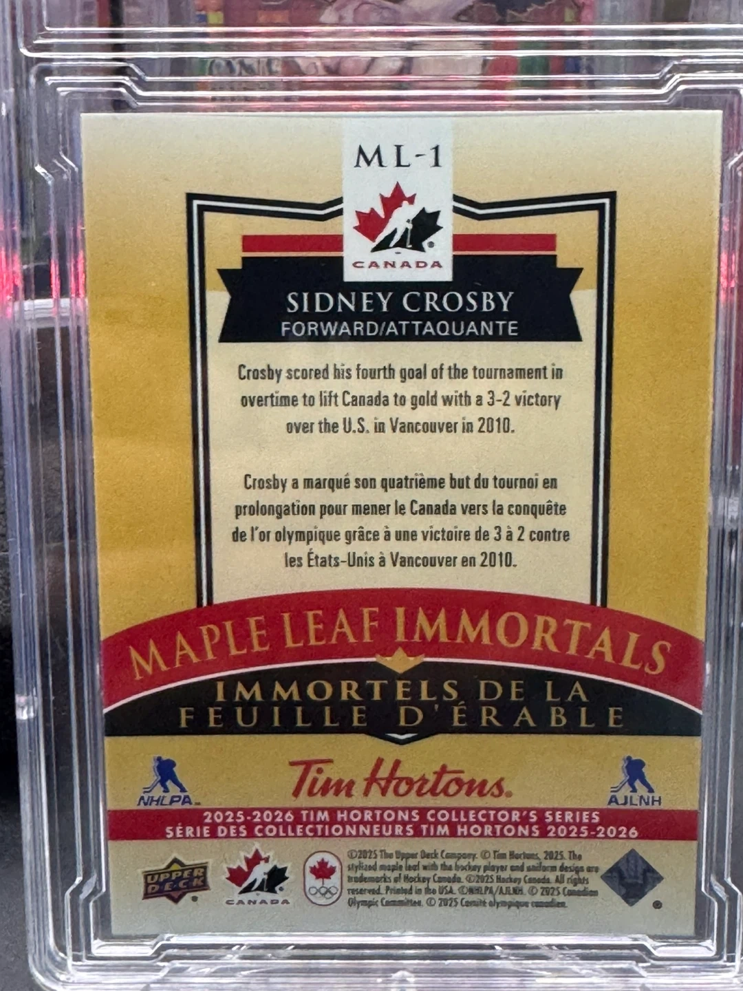 This is a Sidney Crosby trading card from the 2025-2026 Tim Hortons Collector's Series. It commemorates his game-winning goal in overtime at the 2010 Vancouver Olympics. The card is part of the 'Maple Leaf Immortals' subset.