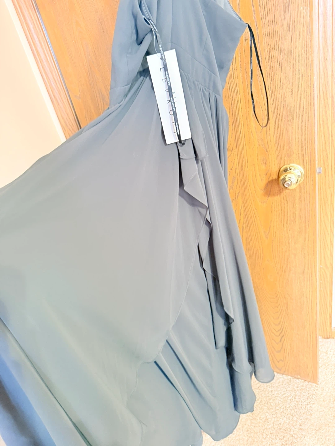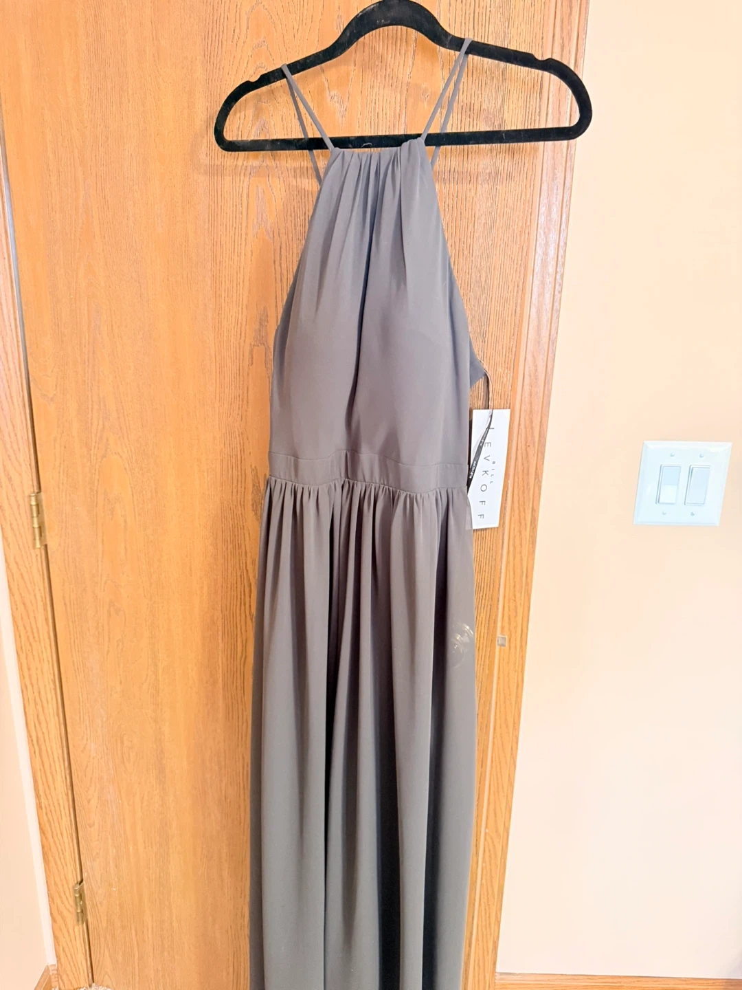Slefkoff halter neck maxi dress in a dusty gray color. Made from 100% polyester. Features a flattering ruched bodice and flowing skirt. Perfect for formal events!