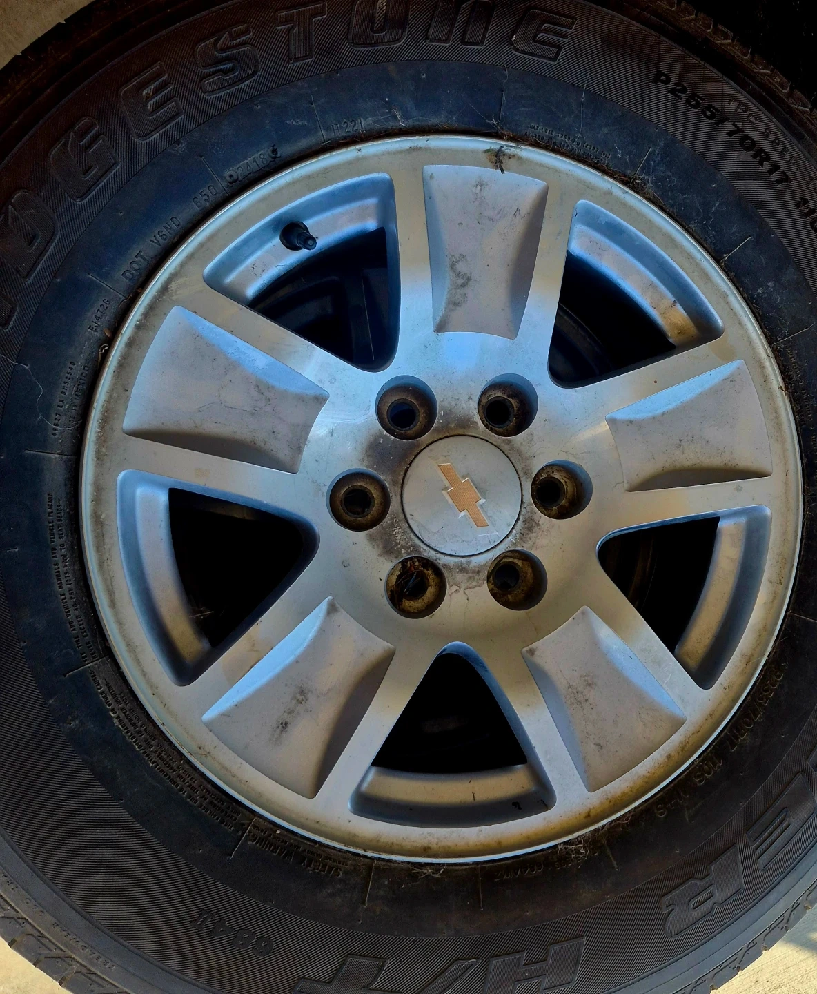 Good Set of 4 Bridgestone Dueler Tires PLUS RIMS Size 225 70 R17 M+S ( Came of 2018 Chevrolet Silverado Truck, Good Tread for 1 Year easy)*REAL DEAL* ( Located in Chestermere only 5 minutes from Easthill Plaza)