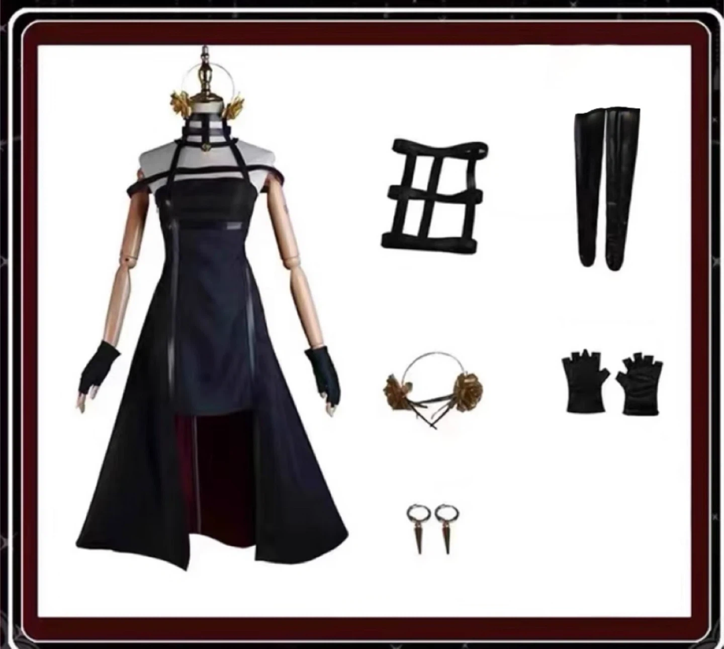 This costume set features a black dress and includes arm warmers, gloves, and a headband. It's a complete look for cosplay events. The material is likely polyester or a blend. It comes with leg guards and a choker.