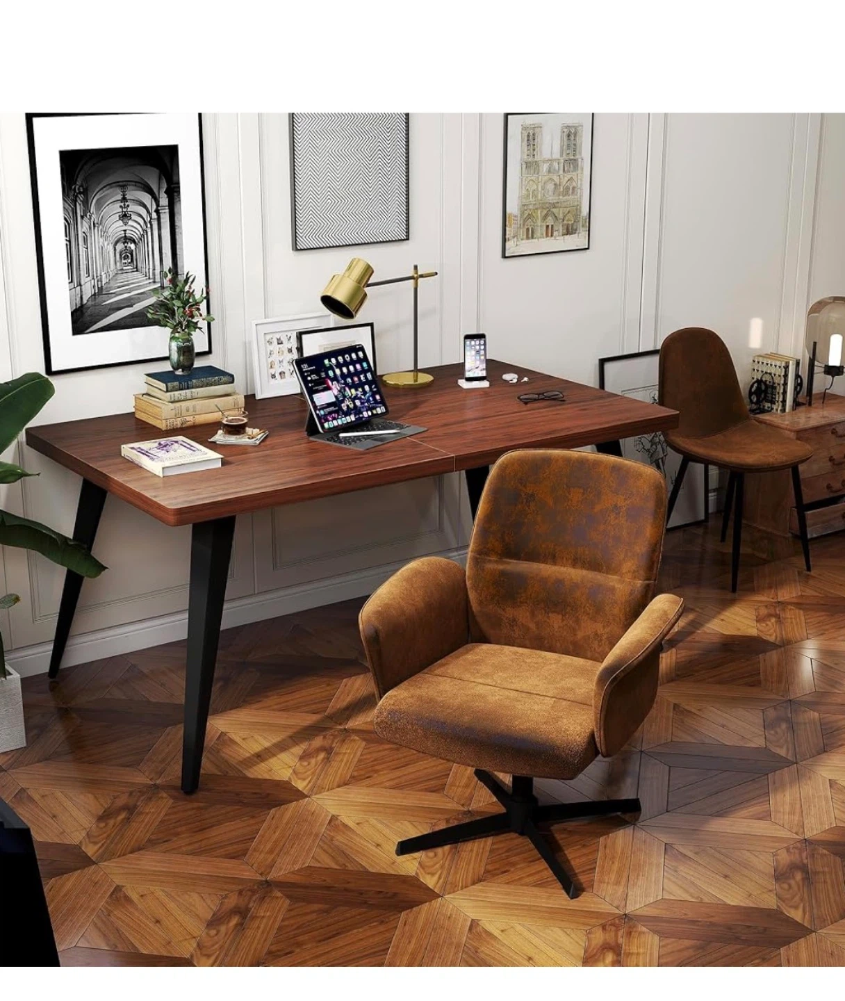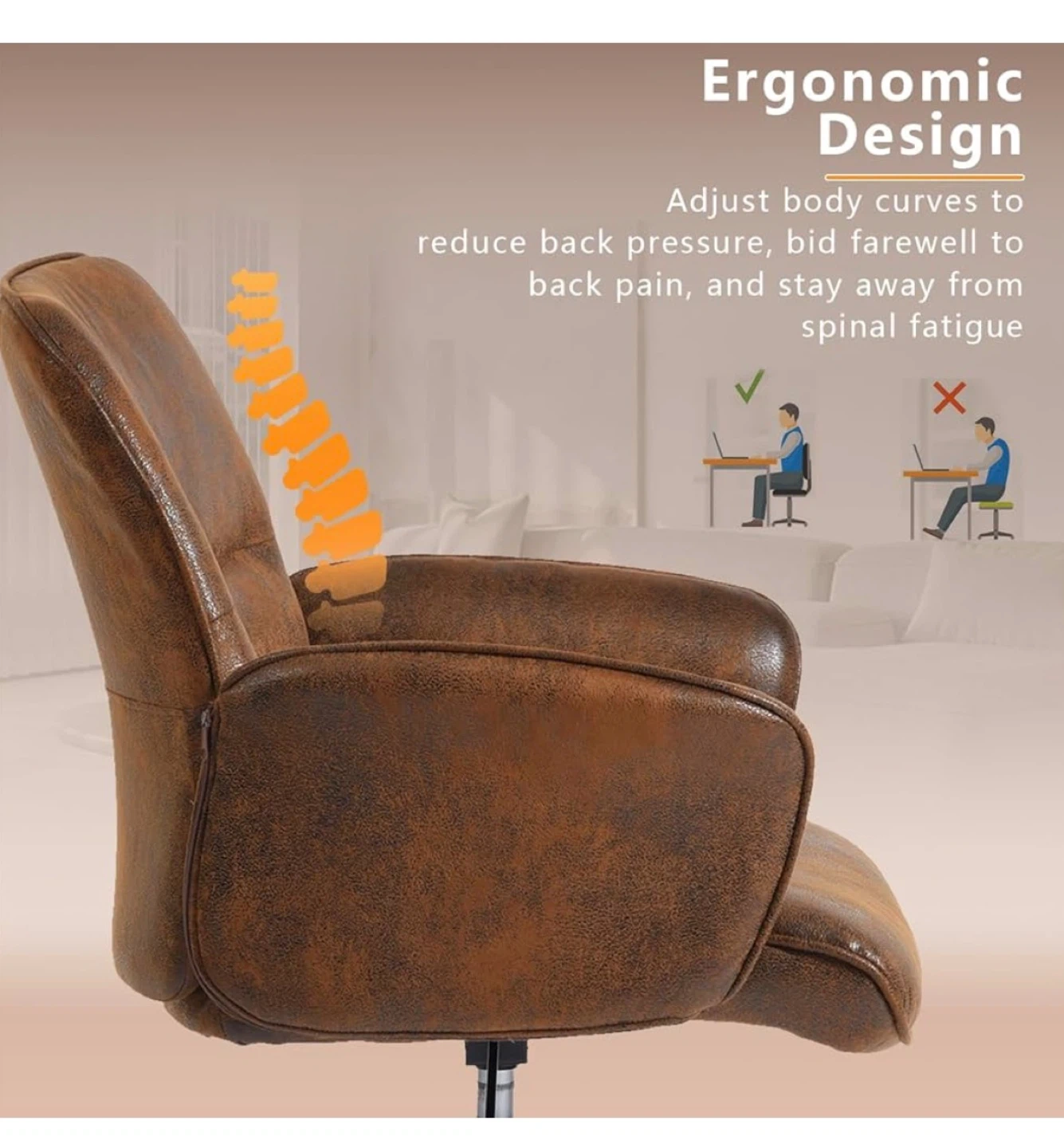 This ergonomic office chair features a brown faux leather finish with a swivel base for easy movement. It's designed to reduce back pressure and spinal fatigue. Great for extended work sessions!