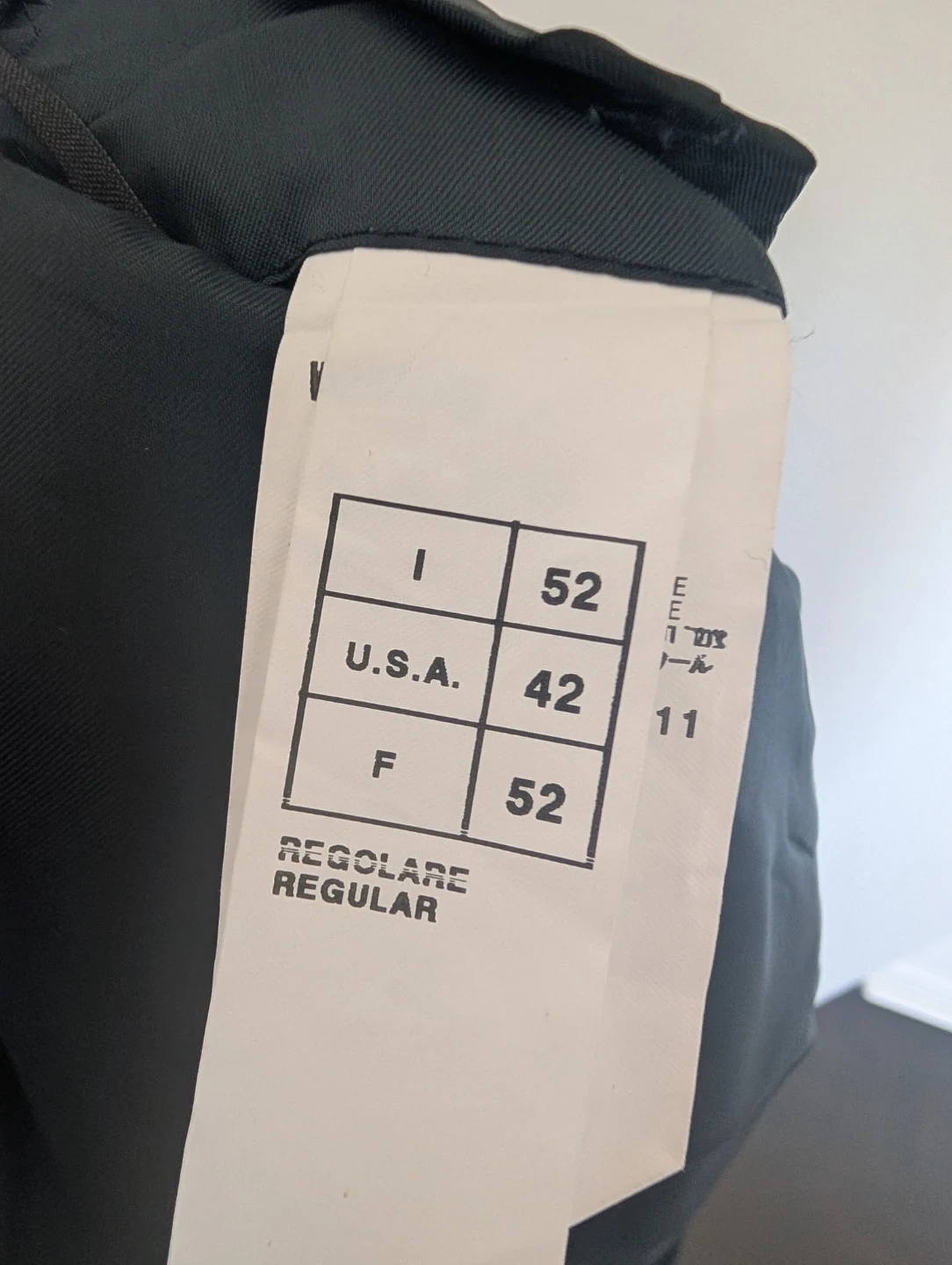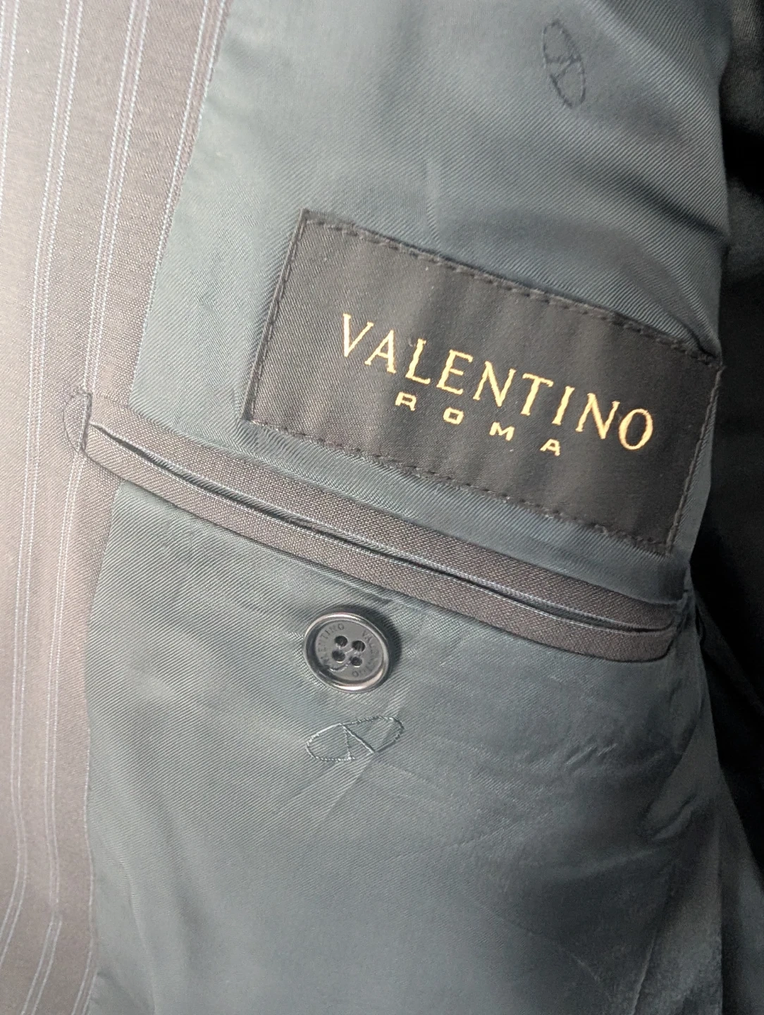Valentino Roma suit jacket and trousers. Dark grey with light blue pinstripes. Made in Italy. Size 42R. 100% Virgin Wool.