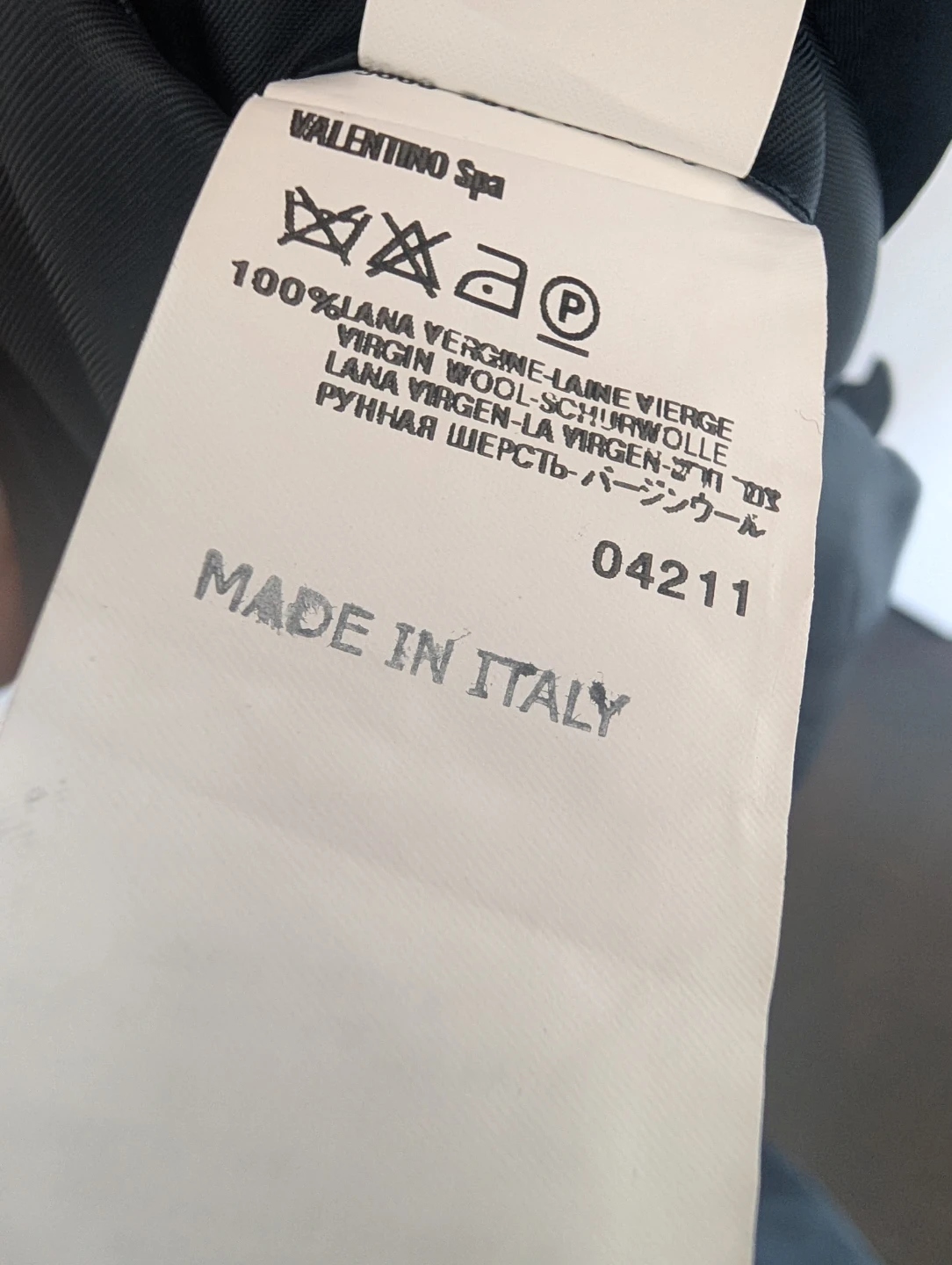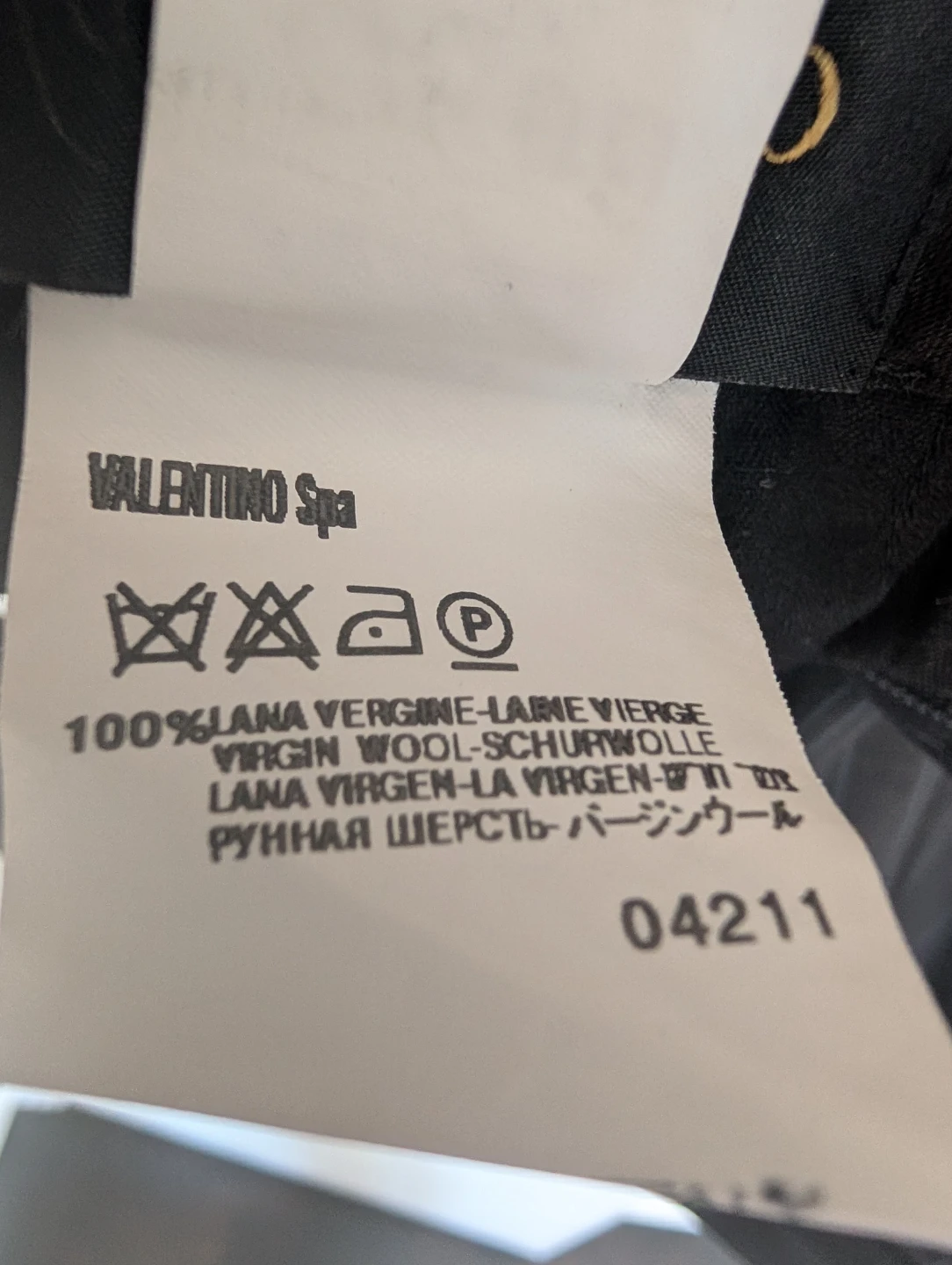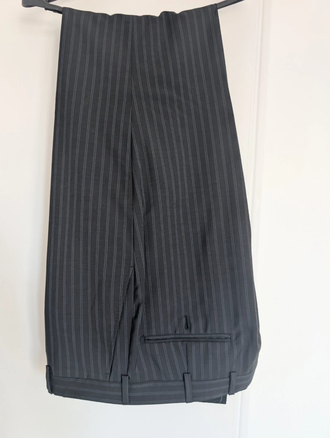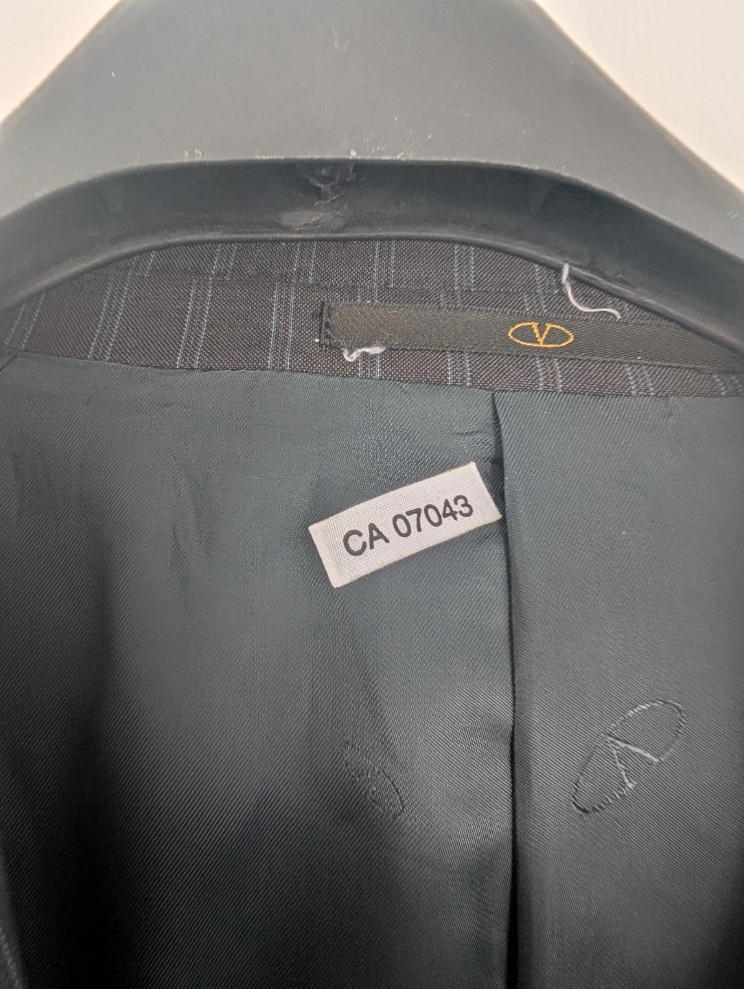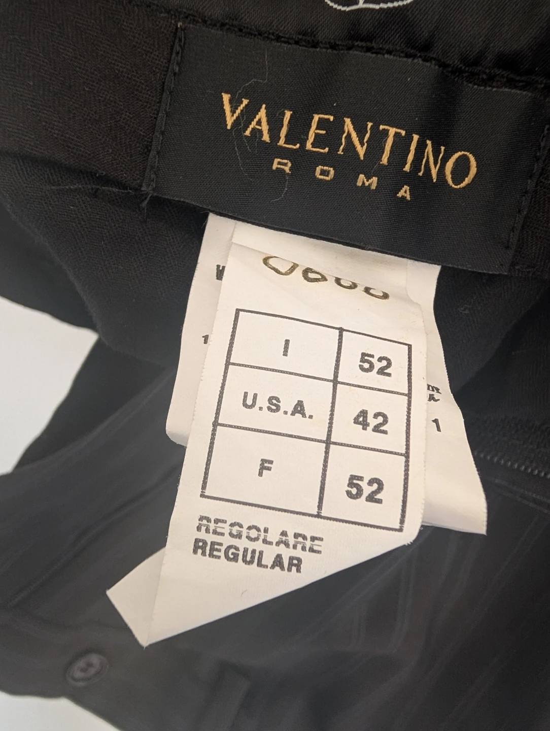 Valentino Roma suit jacket and trousers. Dark grey with light blue pinstripes. Made in Italy. Size 42R. 100% Virgin Wool.