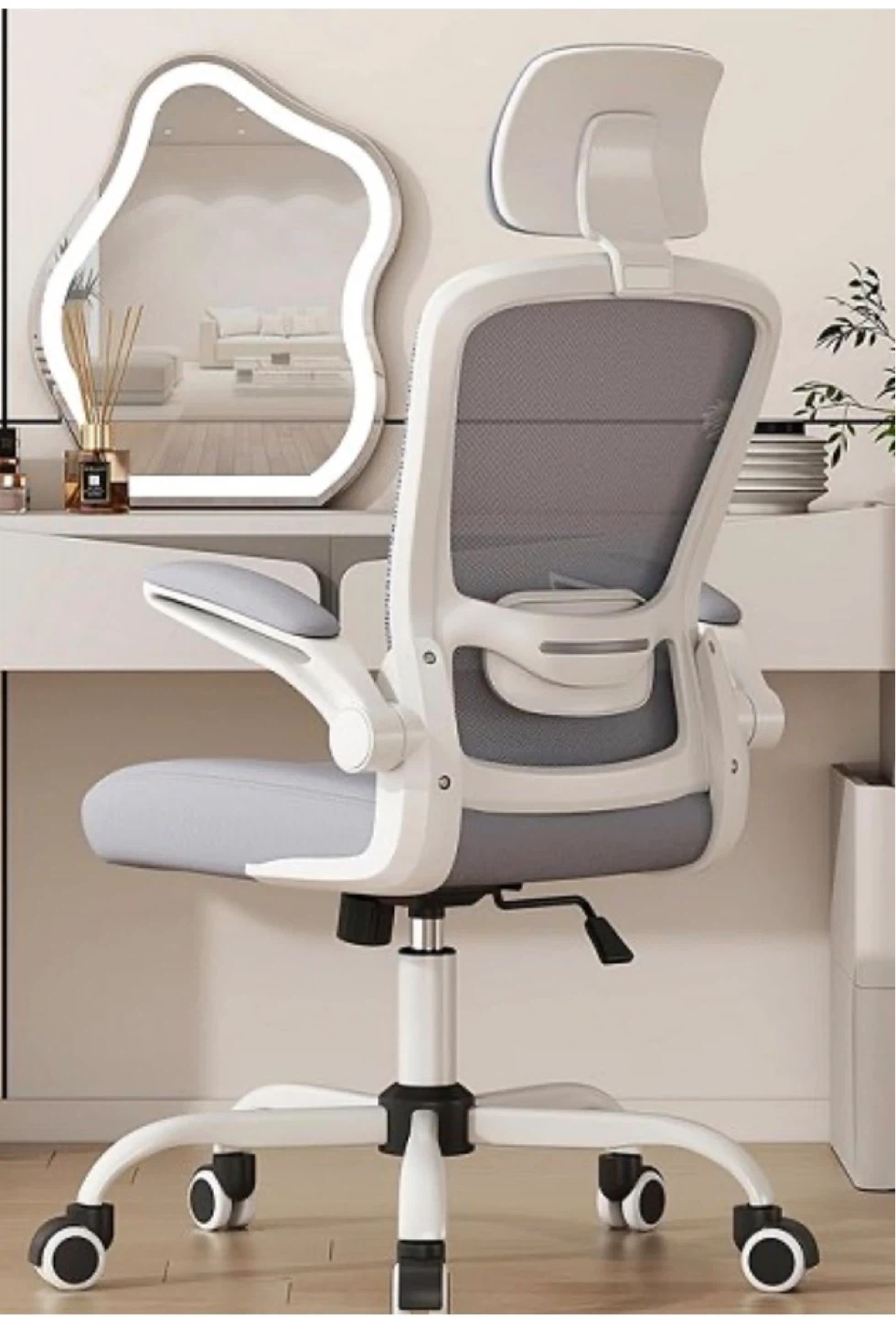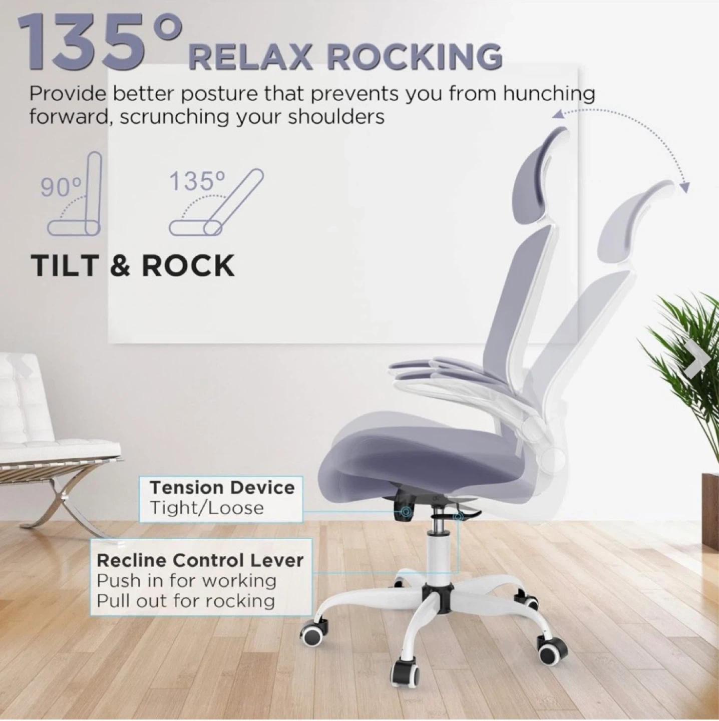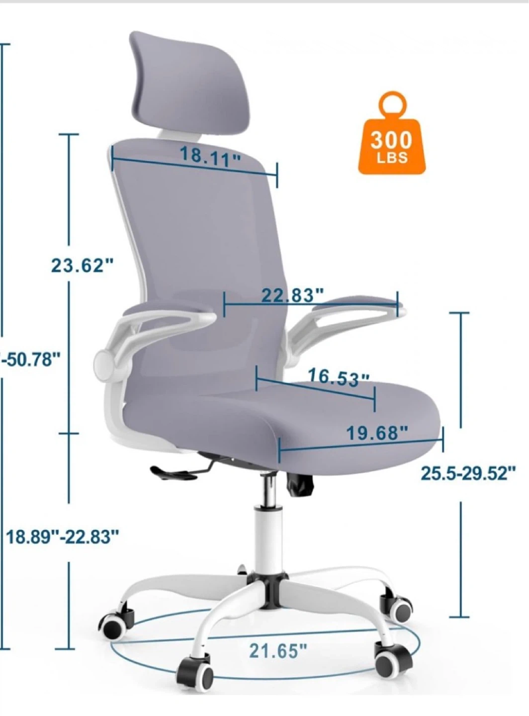 Ergonomic office chair with tilt and rock functionality. It features adjustable height and a breathable mesh back. Seat dimensions are 19.68" wide by 16.53" deep.