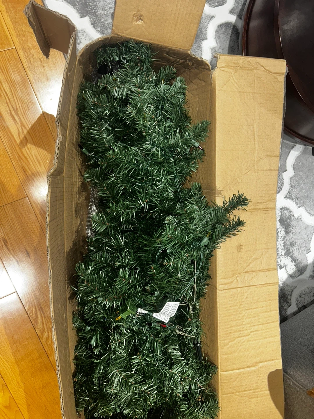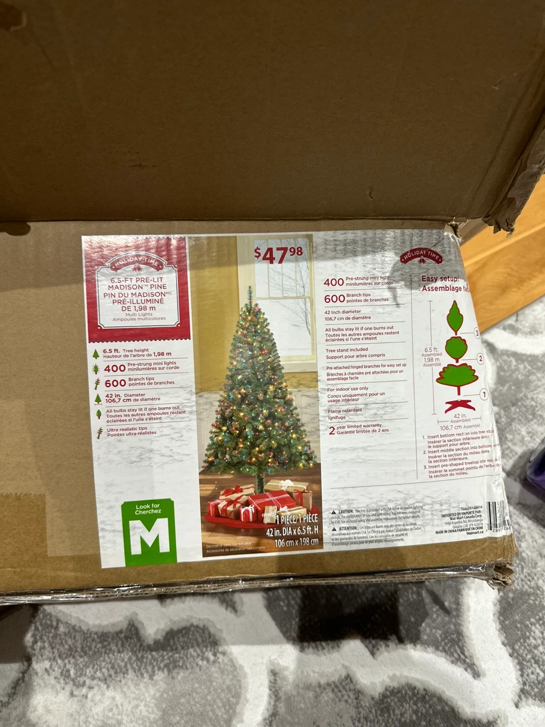 Selling a pre-lit Holiday Time Madison Christmas tree. It's 6.5 ft tall and comes with 600 branch tips and string lights. The tree is 42 inch in diameter. Originally bought for $47.98. Box included unfortunately though last row lights do NOT work.