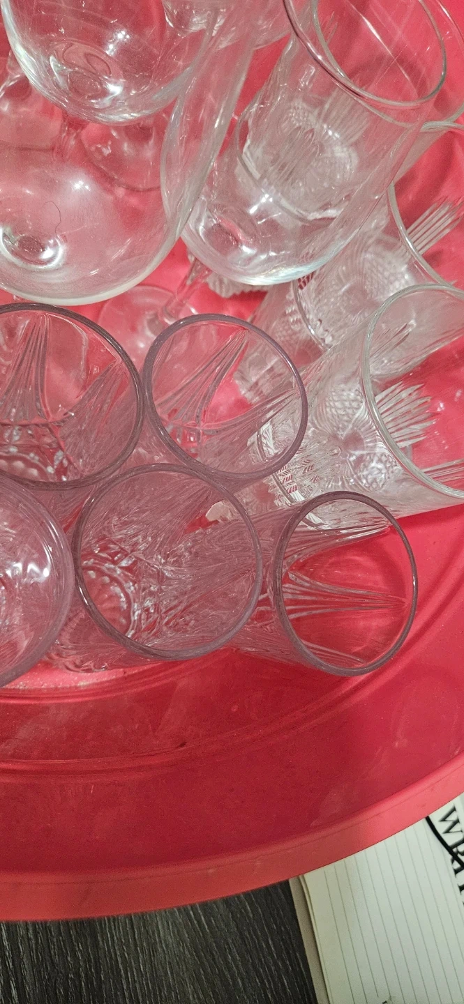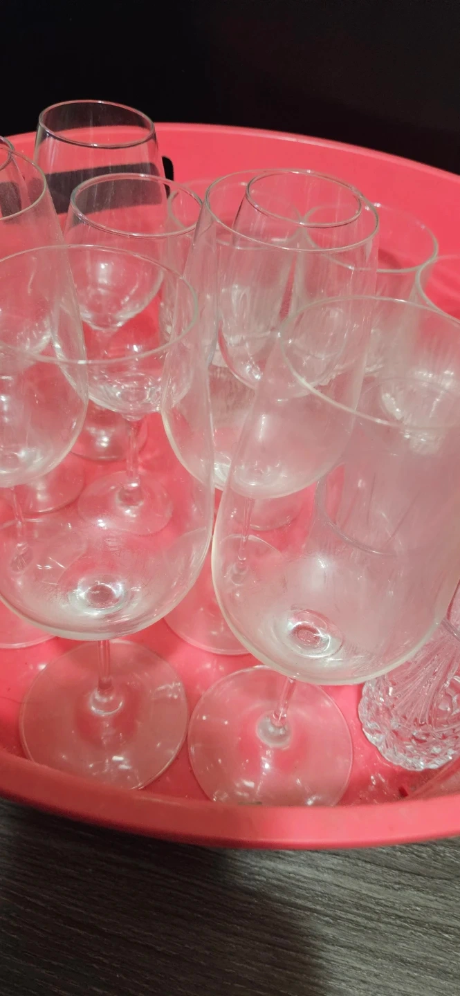 A collection of clear glass drinkware, including wine glasses and tumblers. Various styles and sizes are present. Great for hosting or everyday use!