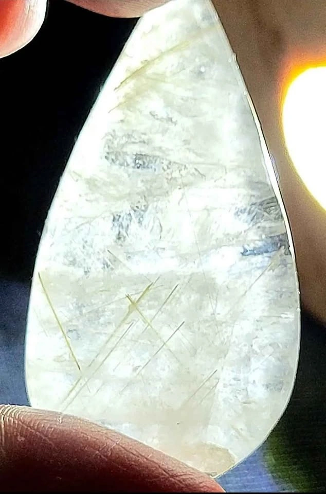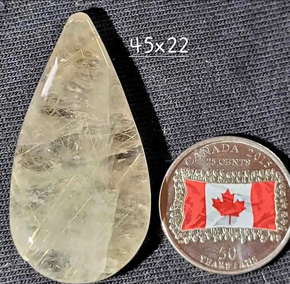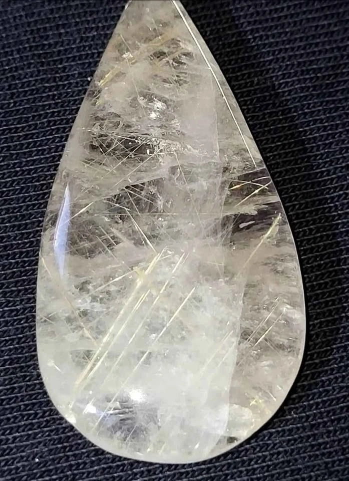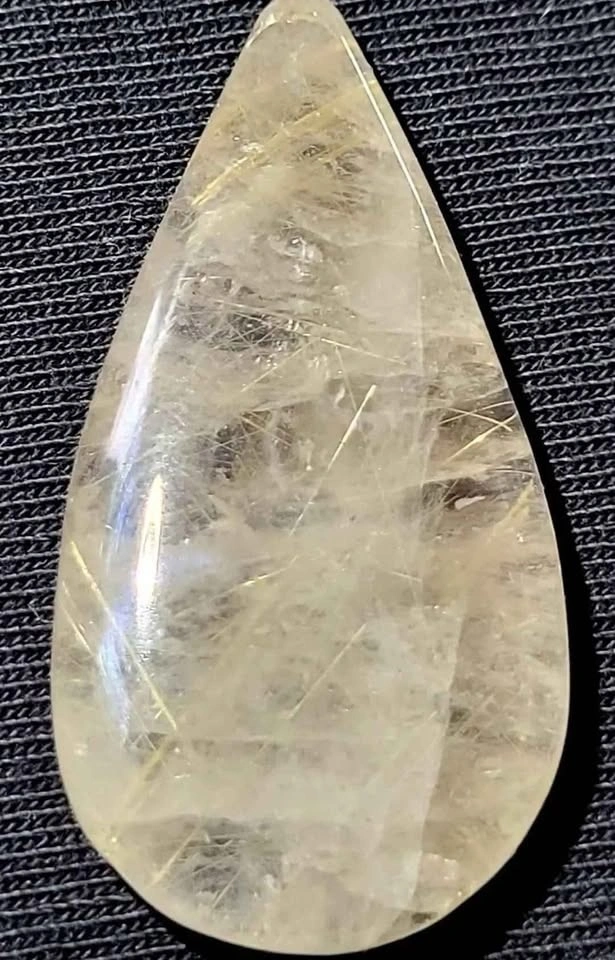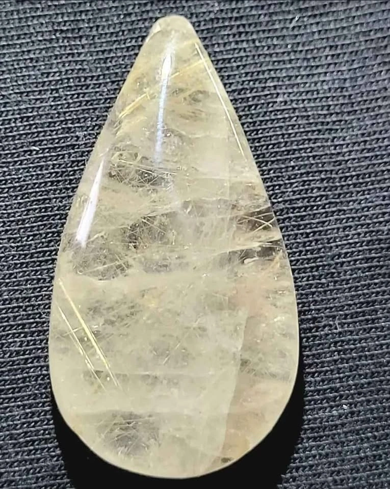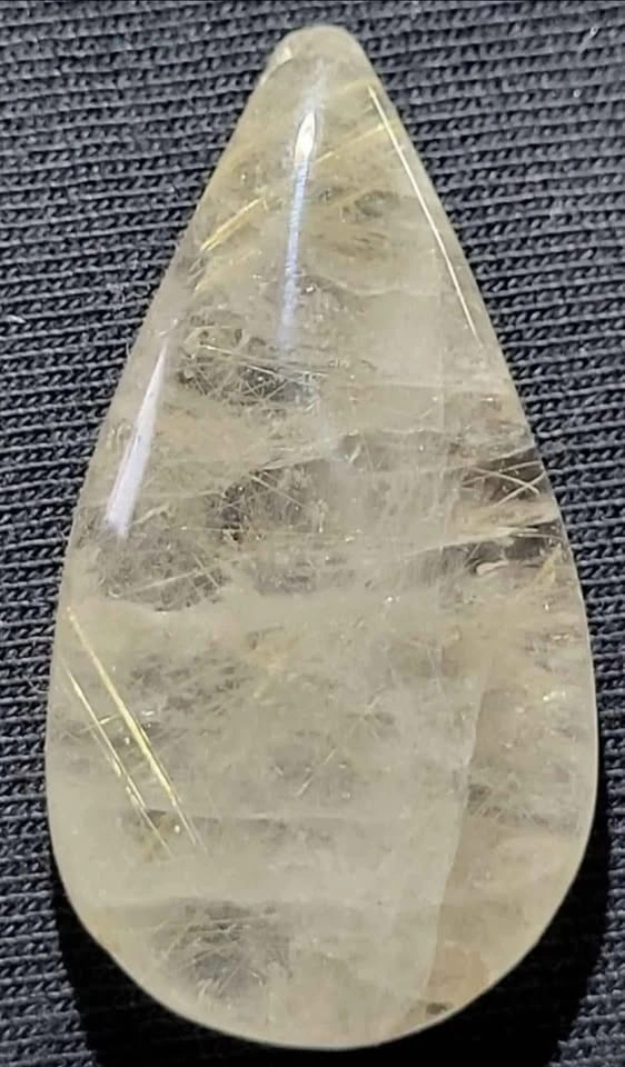 Stunning rare silver and gold Rutilated Quartz tear drop Cabochon. Polished front and back, this excellent cabochon will make any jewelry artist or collector happy!