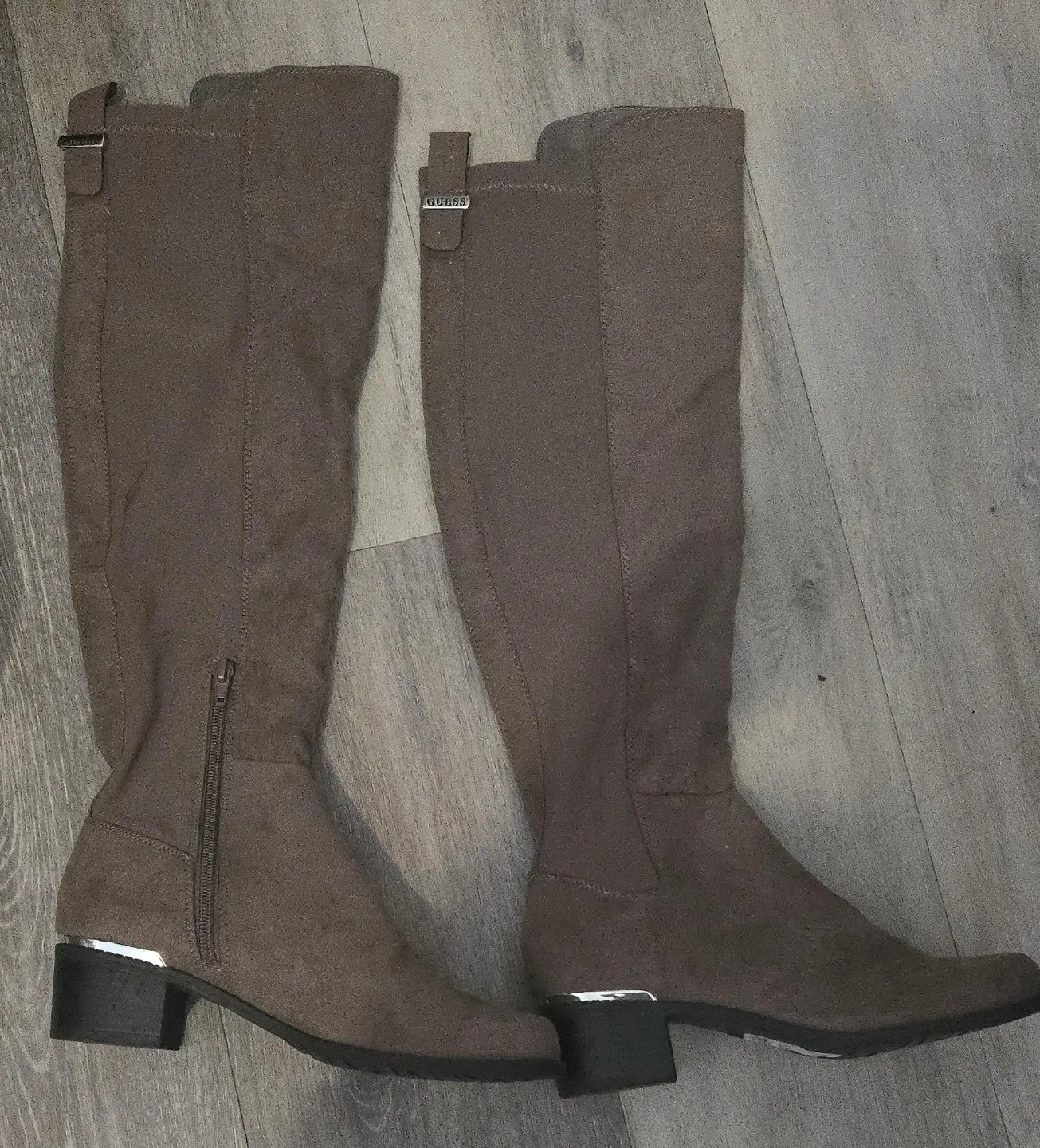 Guess knee-high boots in a rich brown suede-like material. They feature a side zipper for easy wear and a stylish silver accent on the block heel. These boots are a great addition to any fall or winter wardrobe! Size 6