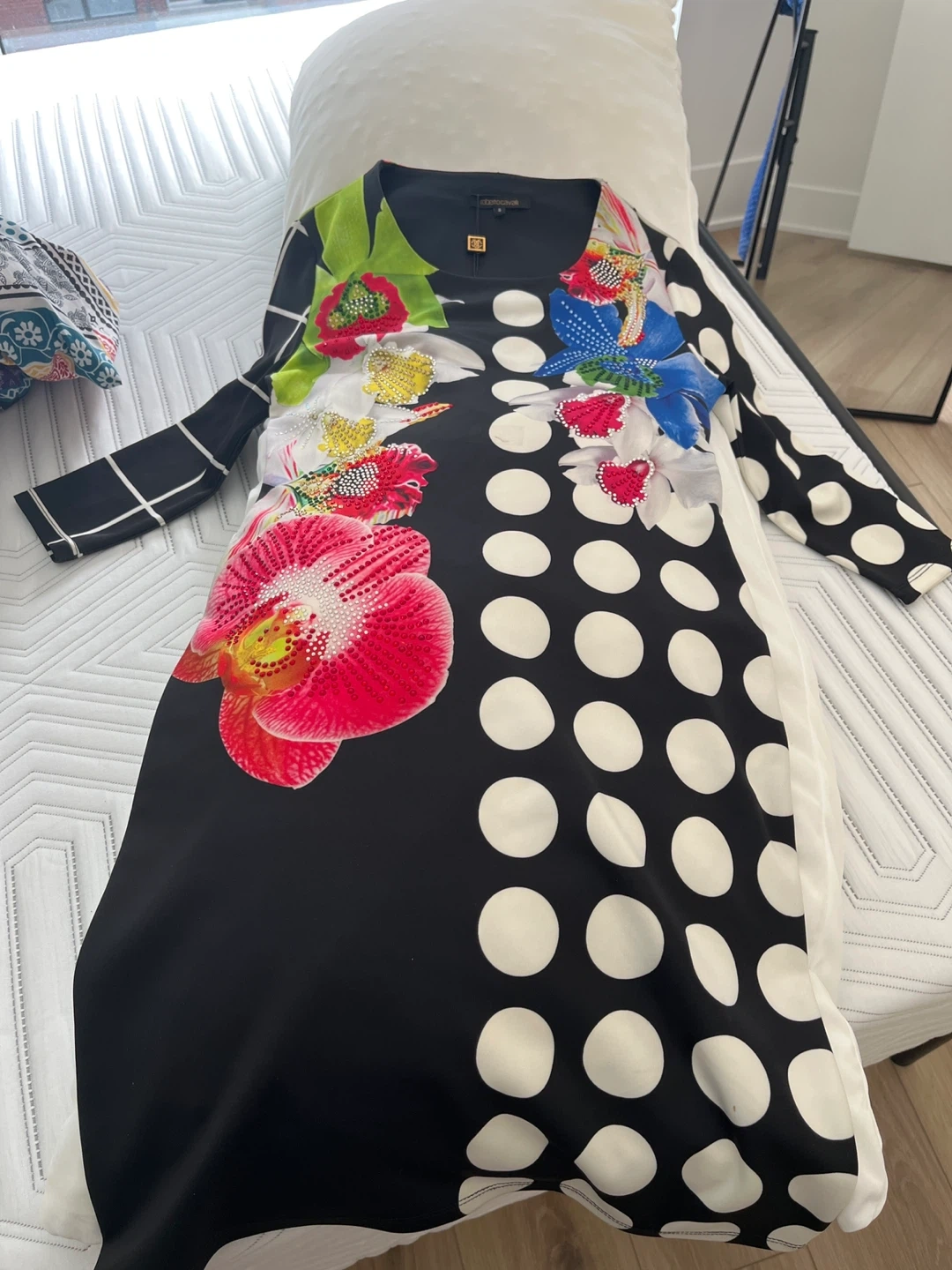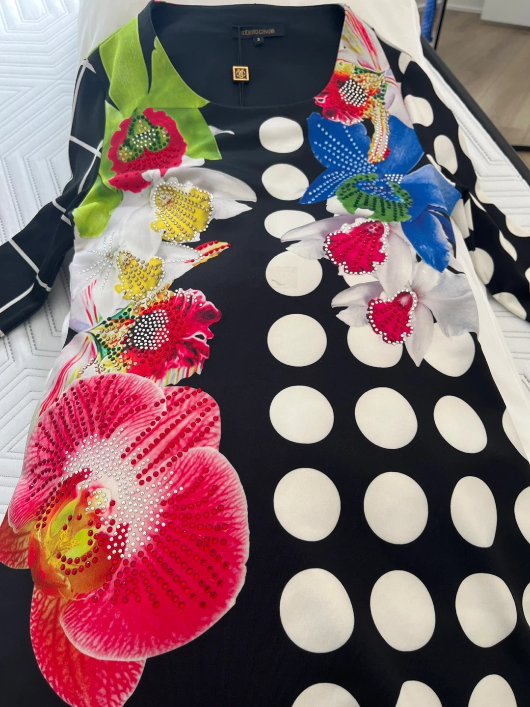 This Roberto Cavalli dress features a vibrant floral print mixed with a classic polka dot pattern. It has long sleeves and a flattering silhouette. Size is S.