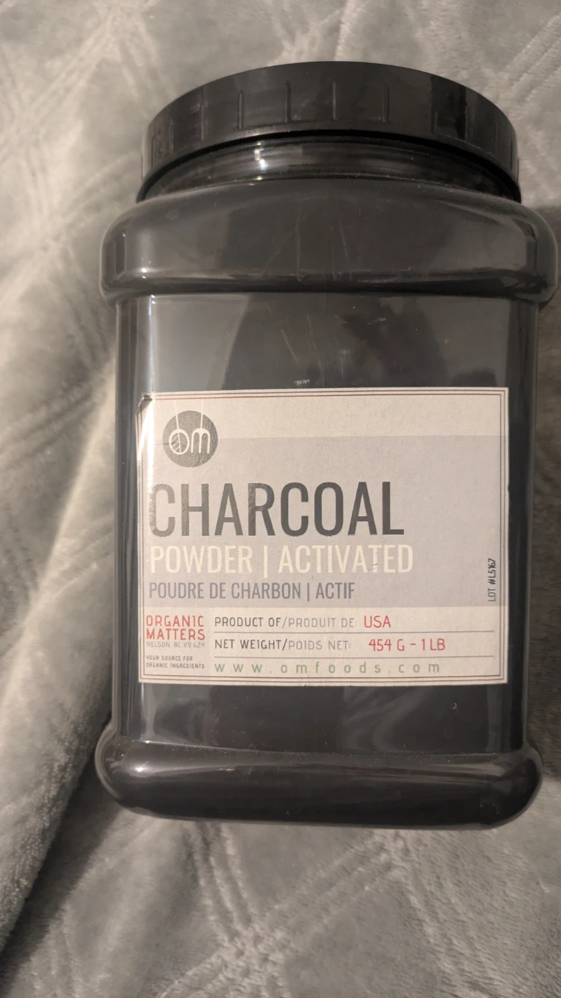 OM Foods Activated Charcoal Powder. It's a 1 LB (454g/ 1lb) container. It is 80% full but have used minimal amount (weight should be around 400g of product).