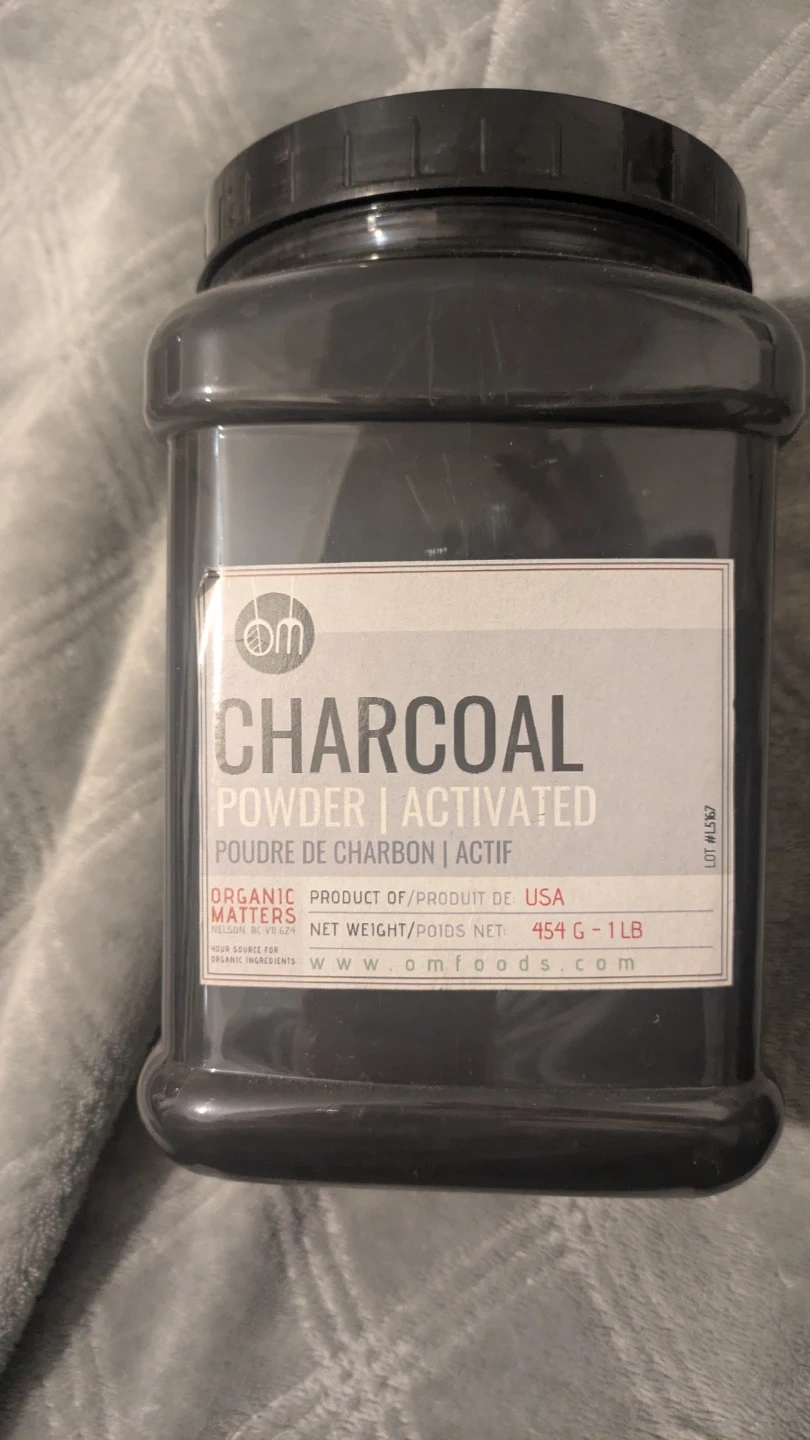 OM Foods Activated Charcoal Powder. It's a 1 LB (454g/ 1lb) container. It is 80% full but have used minimal amount (weight should be around 400g of product). Originally purchased at Organic Matters Foods for diy bath salts & facemasks.