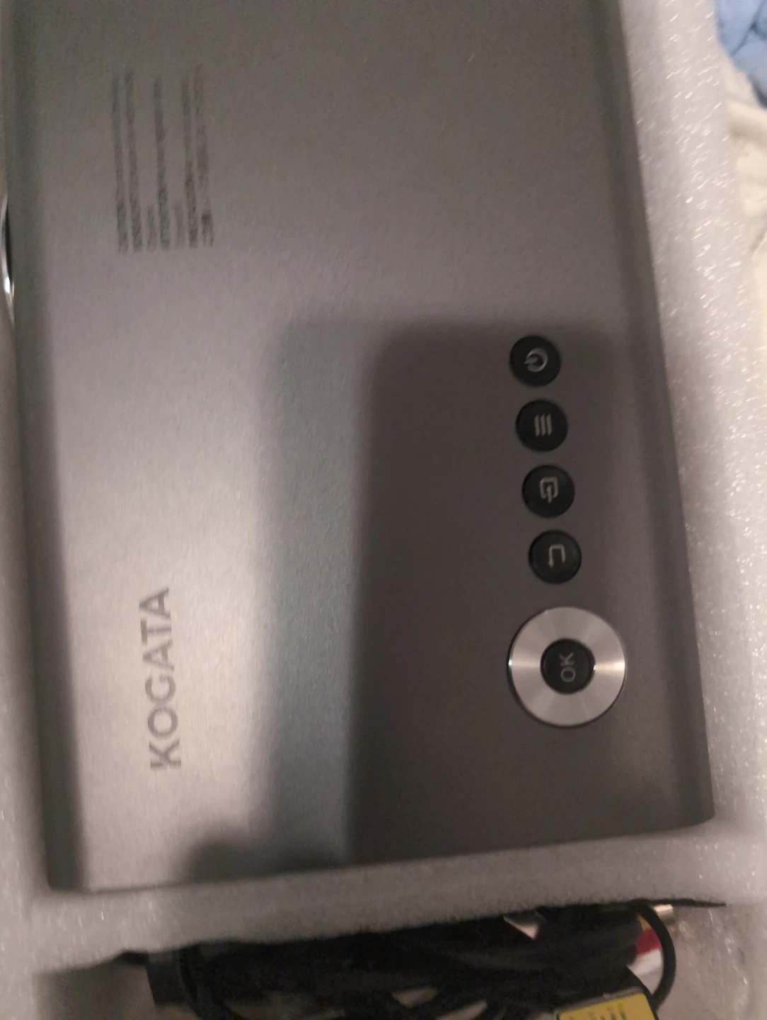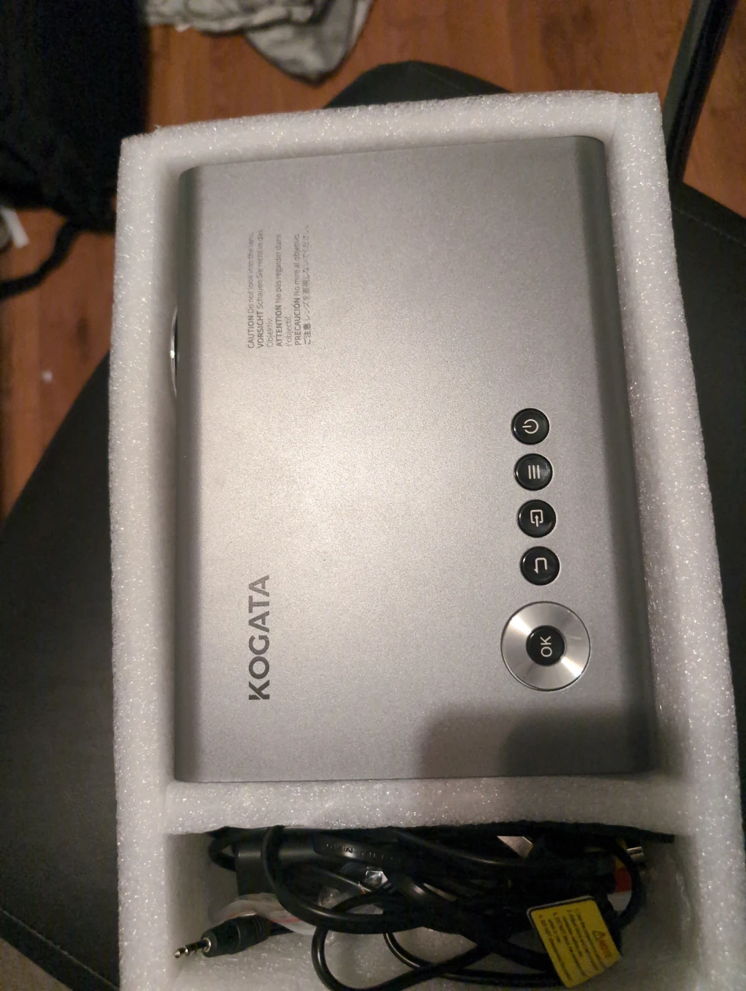This is a KOGATA mini projector. It's a compact device for home entertainment. Includes power cable and remote.