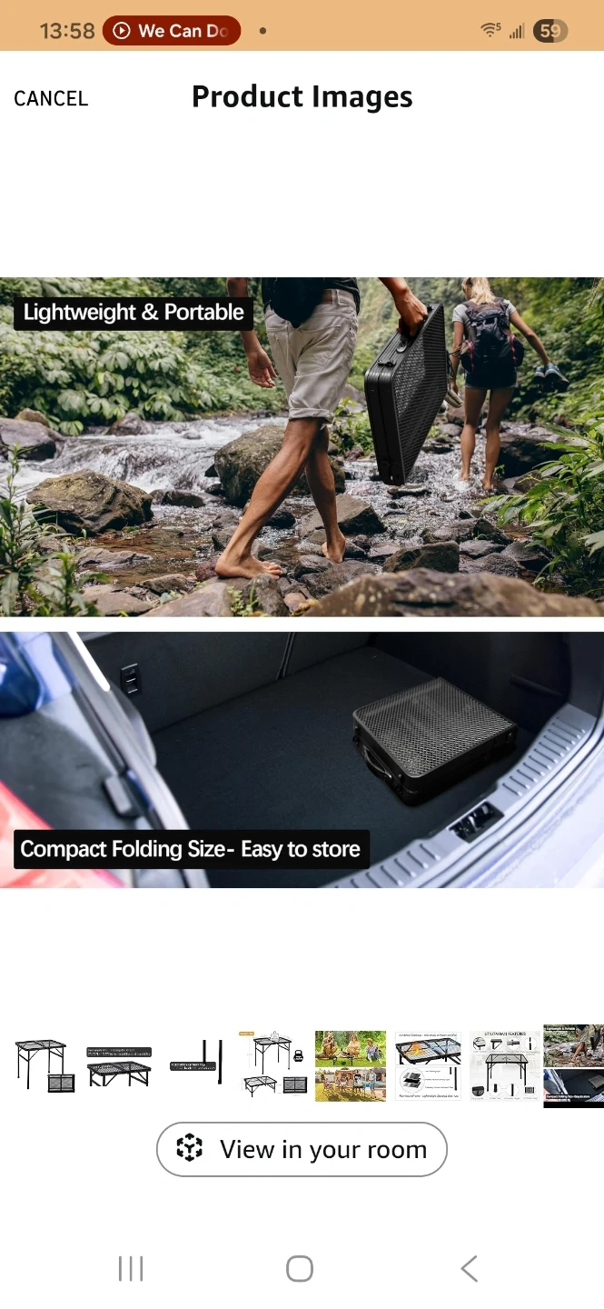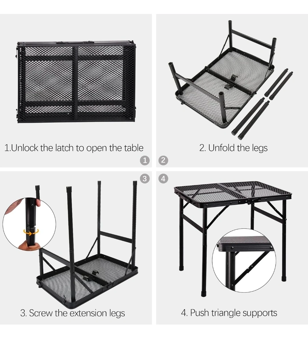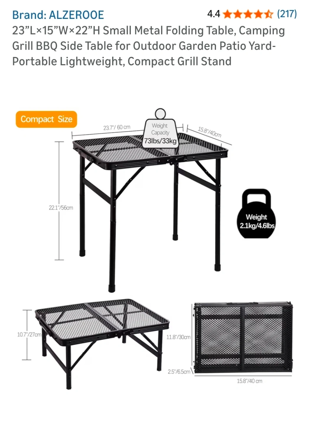 This ALZEROOE folding table features an iron mesh tabletop that's water and fire resistant. It has an aluminum frame that's sturdy and anti-rust. The table's compact folding size makes it easy to store and transport. Its weight capacity is 73lbs/33kg, and it weighs only 2.1kg/4.6lbs.