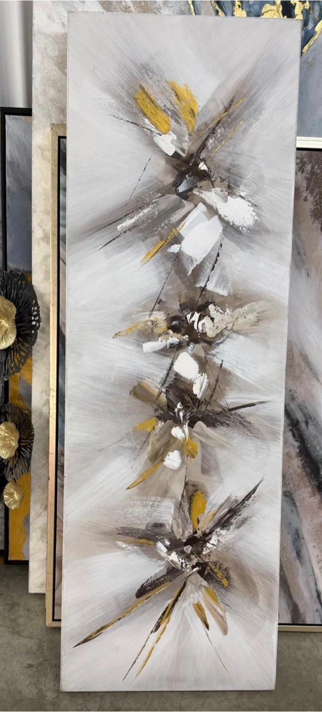 Modern abstract canvas painting. It's 44 cm wide and 1.47 m tall. Gold, white, and grey tones. Adds a sophisticated touch to any room.