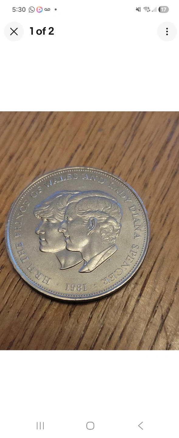 A commemorative coin from 1981 featuring Prince Charles and Lady Diana Spencer. It depicts their portraits along with the inscription "H.R.H. The Prince Of Wales And Lady Diana Spencer".