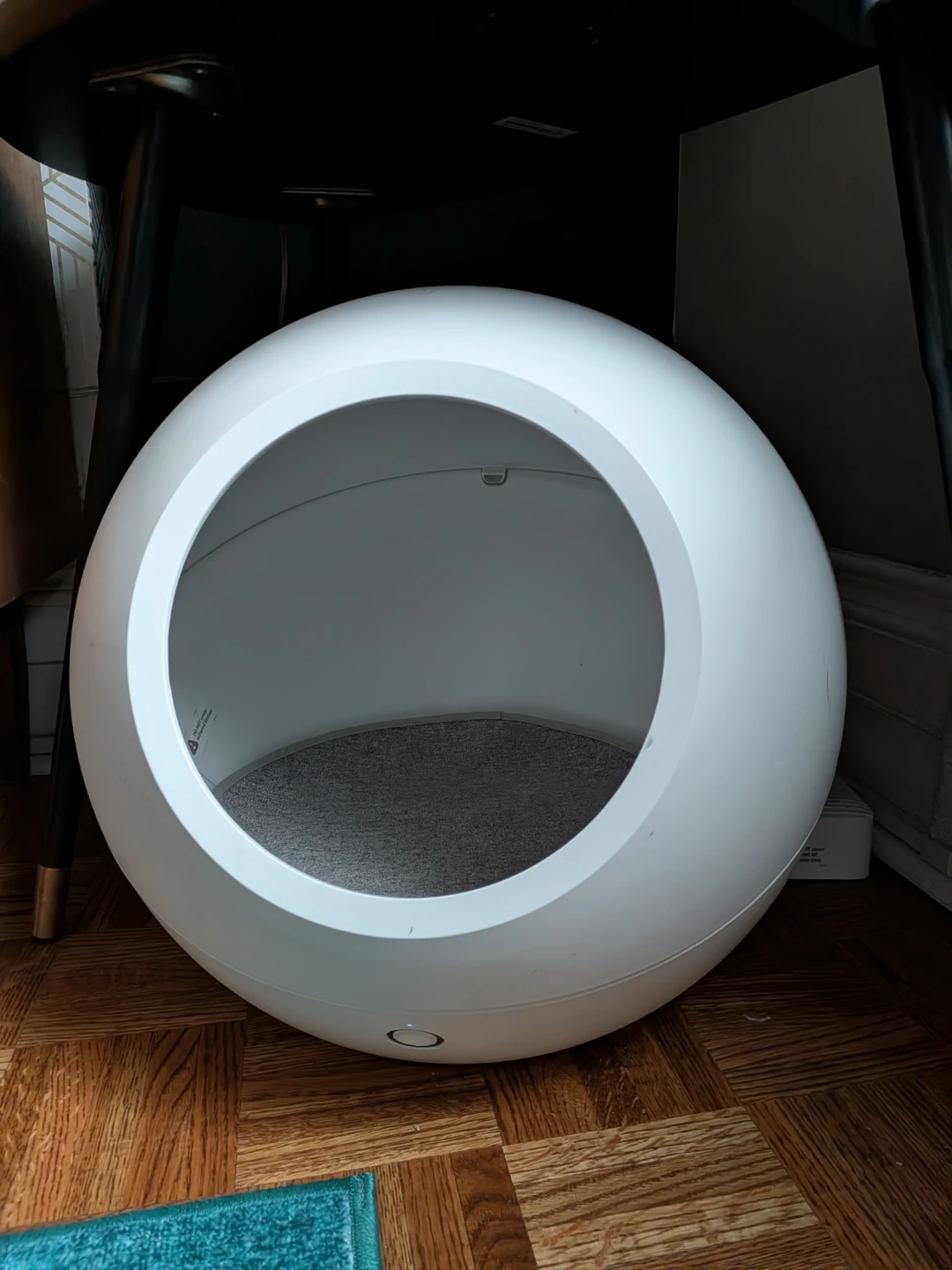 This is a white spherical cat bed by Petkit. It's made of durable plastic with a felt interior. The enclosed design offers a cozy space for your cat.
