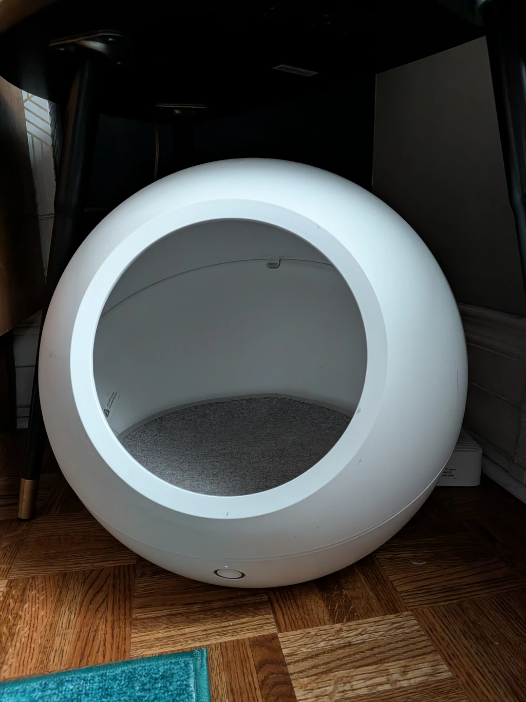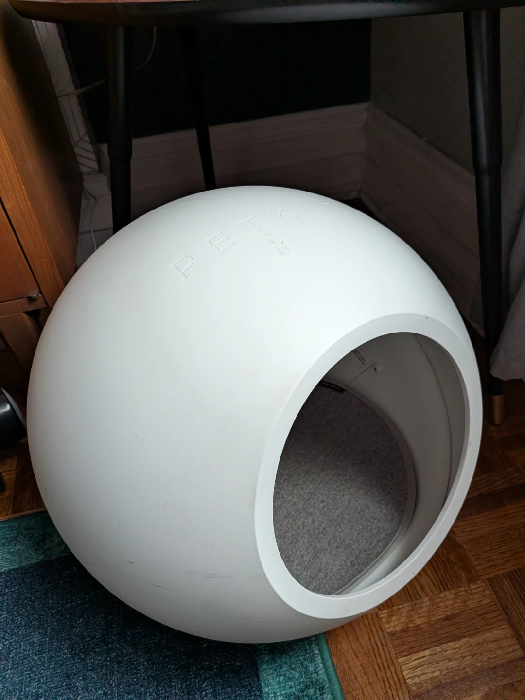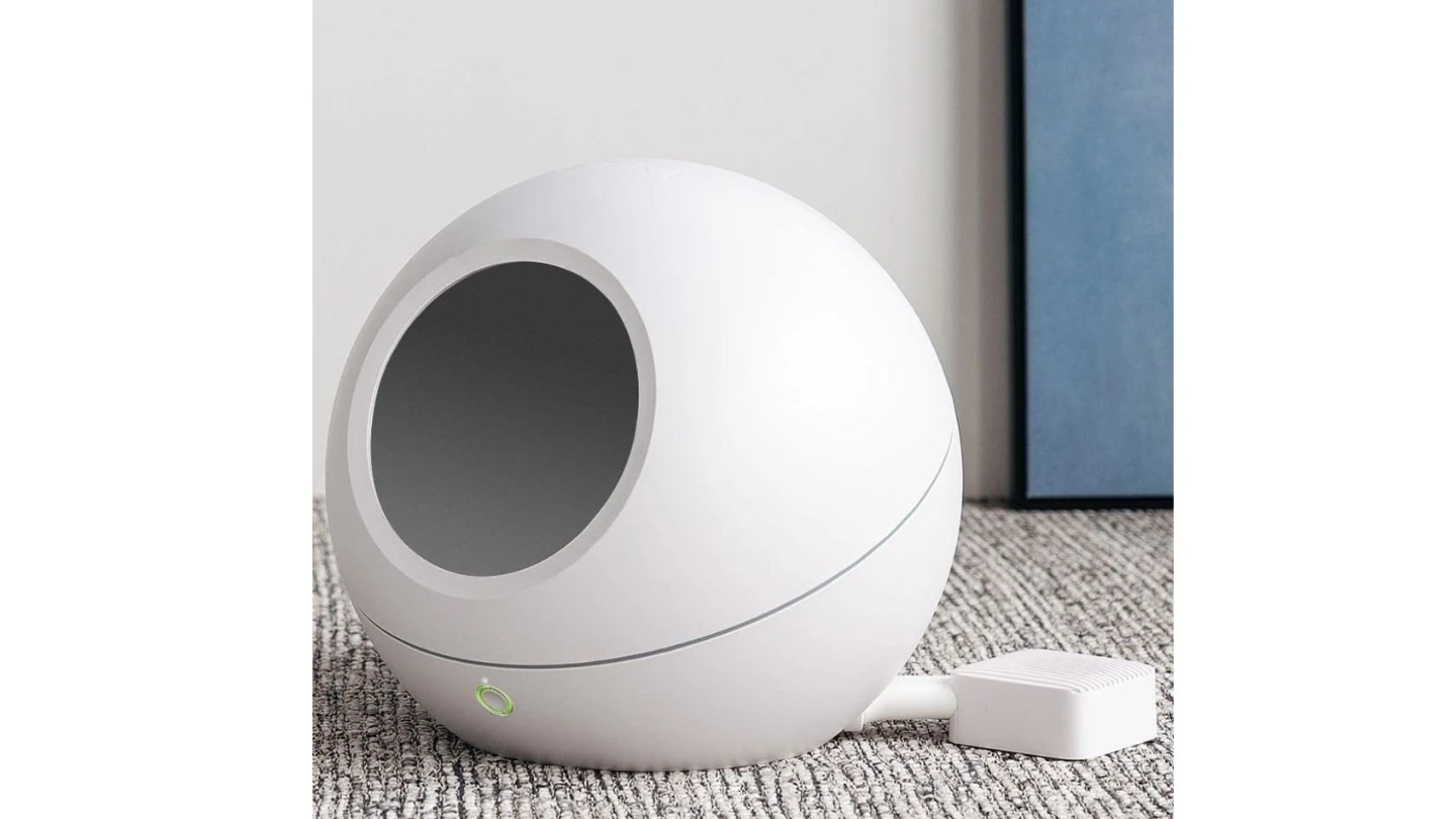 This is a white spherical cat bed by Petkit. It's made of durable plastic with a felt interior. The enclosed design offers a cozy space for your cat.