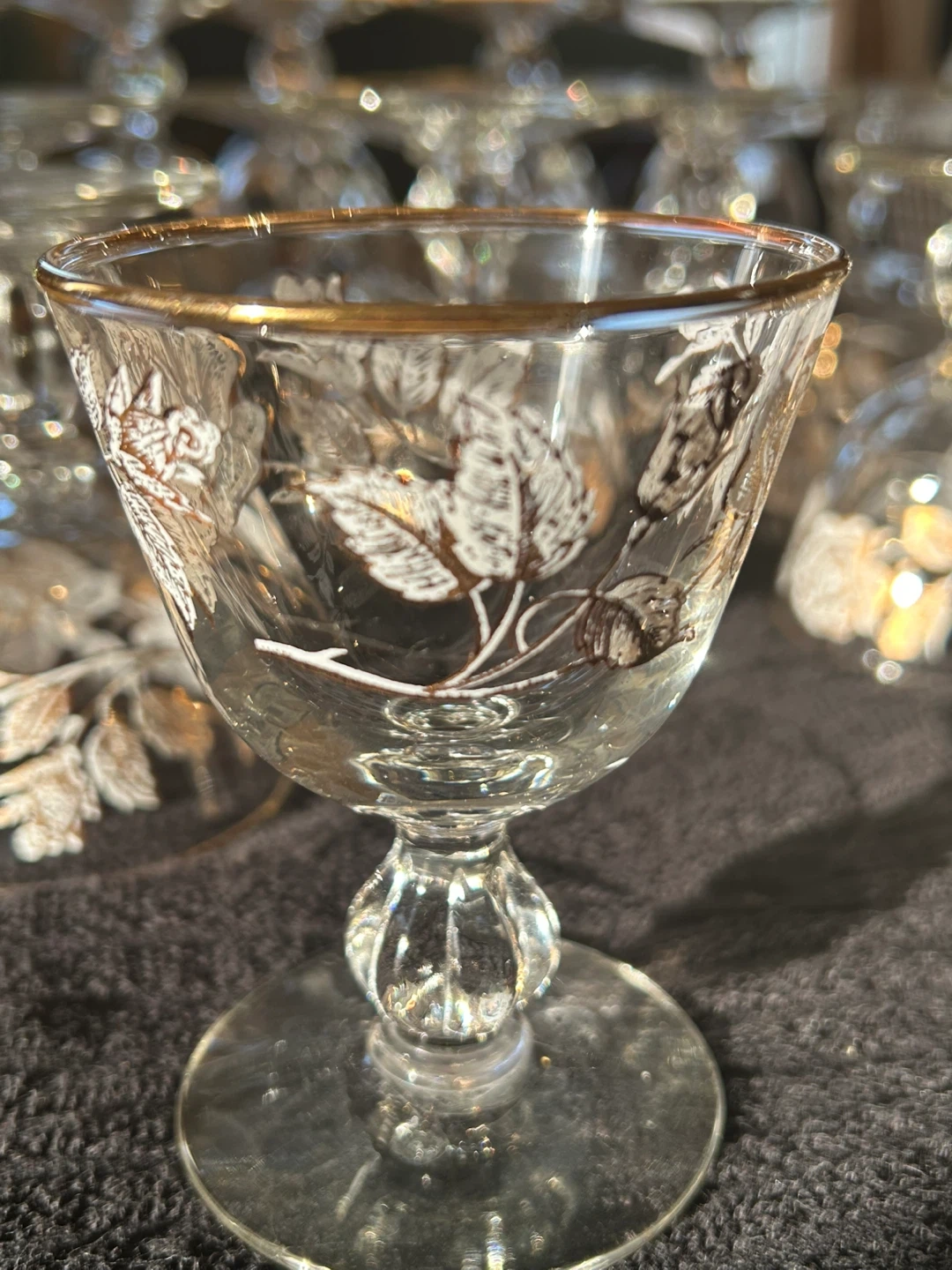 Set of 16 Vintage Etched Wine Glasses with Gold Rims