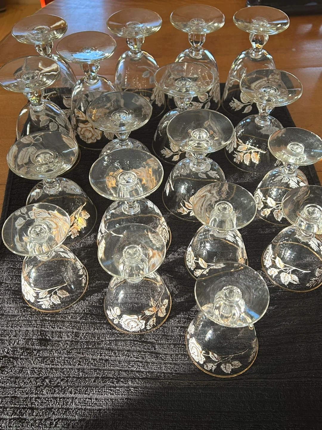 These vintage wine glasses feature delicate etched floral patterns and gold rims. They come in a set of 16, perfect for hosting or special occasions. Made of clear glass with three different sizes available.