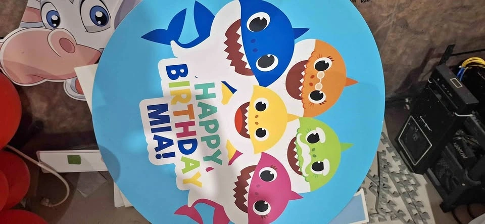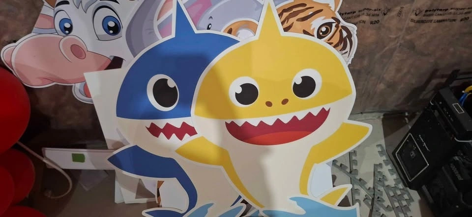 Awesome party decorations for a birthday celebration. This set has a fun Baby Shark 'Happy Birthday Mia!' sign, plus stand-up cutouts of blue and yellow Baby Shark characters. Also includes cute animal cutouts like a cow, elephant, and tiger. Comes with a bunch of red, yellow, and gold balloons, and some cool Mickey Mouse foil balloons too!