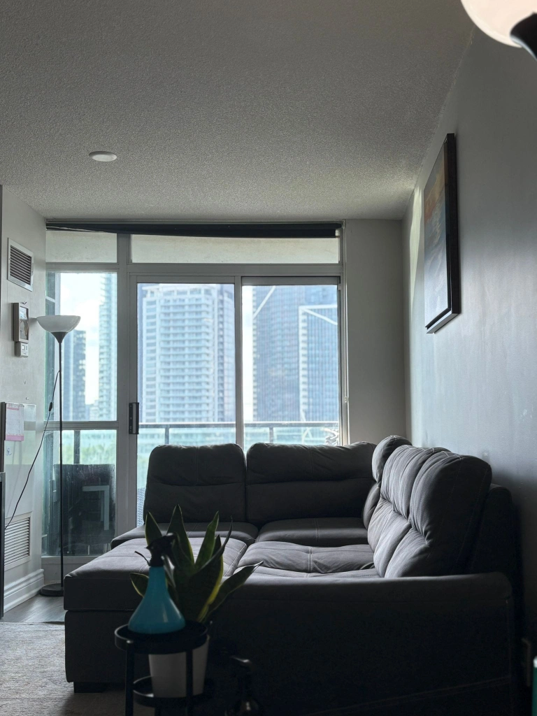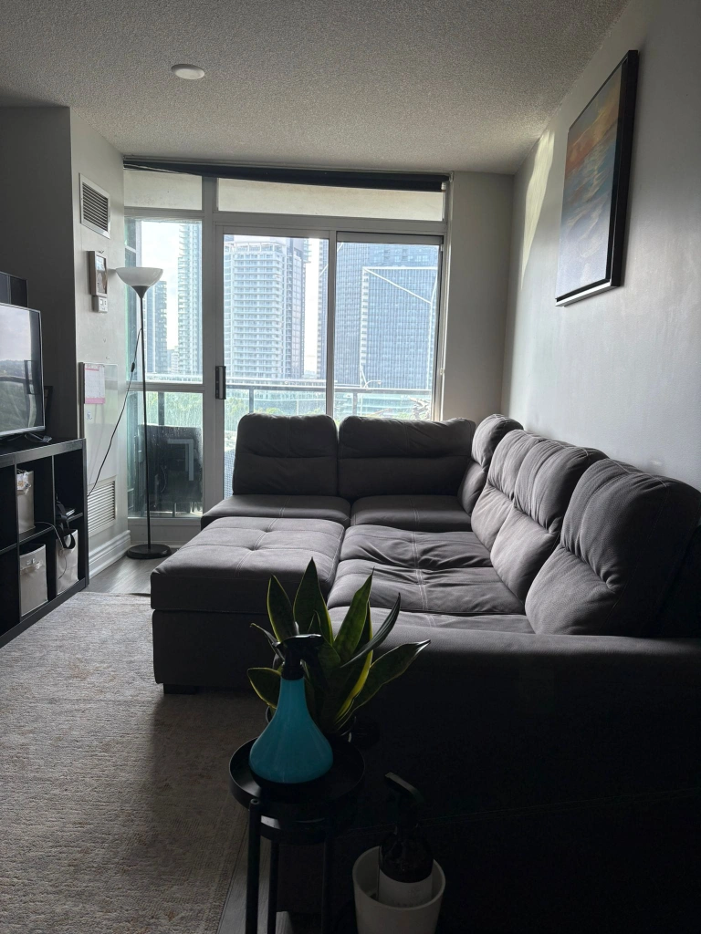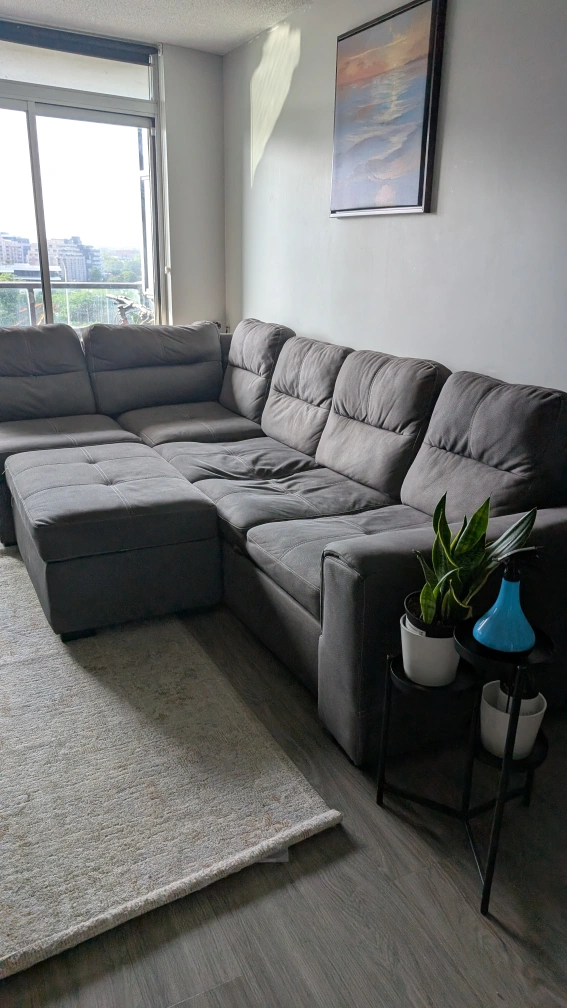 Selling a comfy grey L shaped sectional sofa with a handy storage ottoman! It's in good condition and perfect for lounging and relaxing in your living room. The ottoman provides extra seating and a convenient place to store blankets or other items. Great for small spaces!