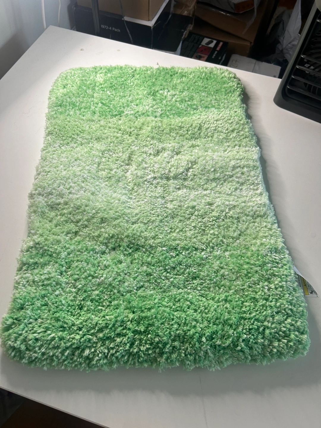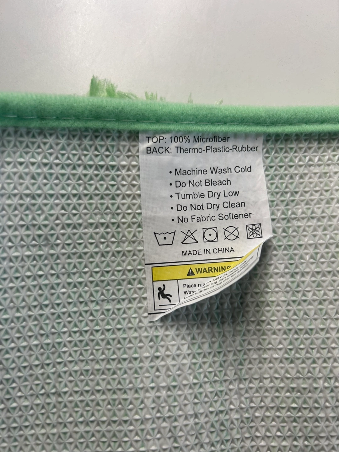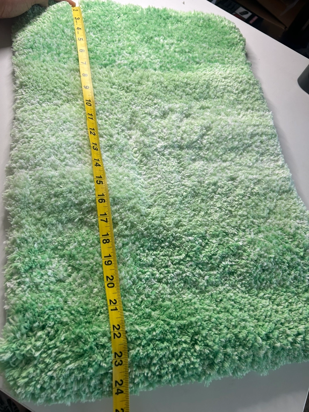 34Here's a super soft green bath mat, perfect for adding a little cozy touch to your bathroom! It measures approximately 24 inches in length and 16 inches in width. The top is 100% microfiber, and the back is thermo-plastic-rubber. It's machine washable on a cold cycle, tumble dry low, and avoid using bleach or fabric softener!