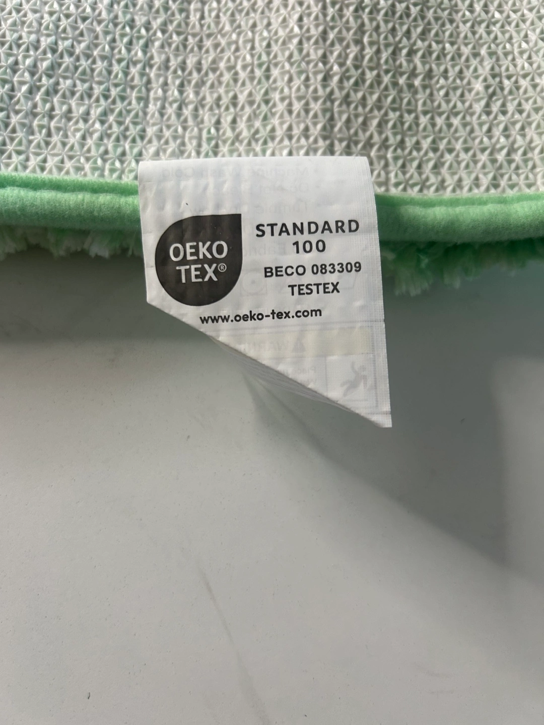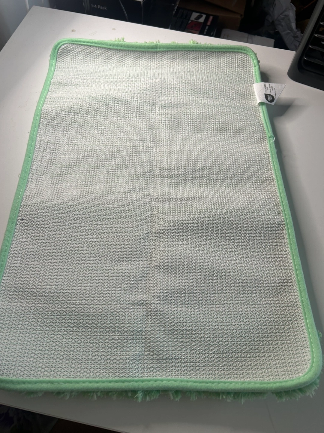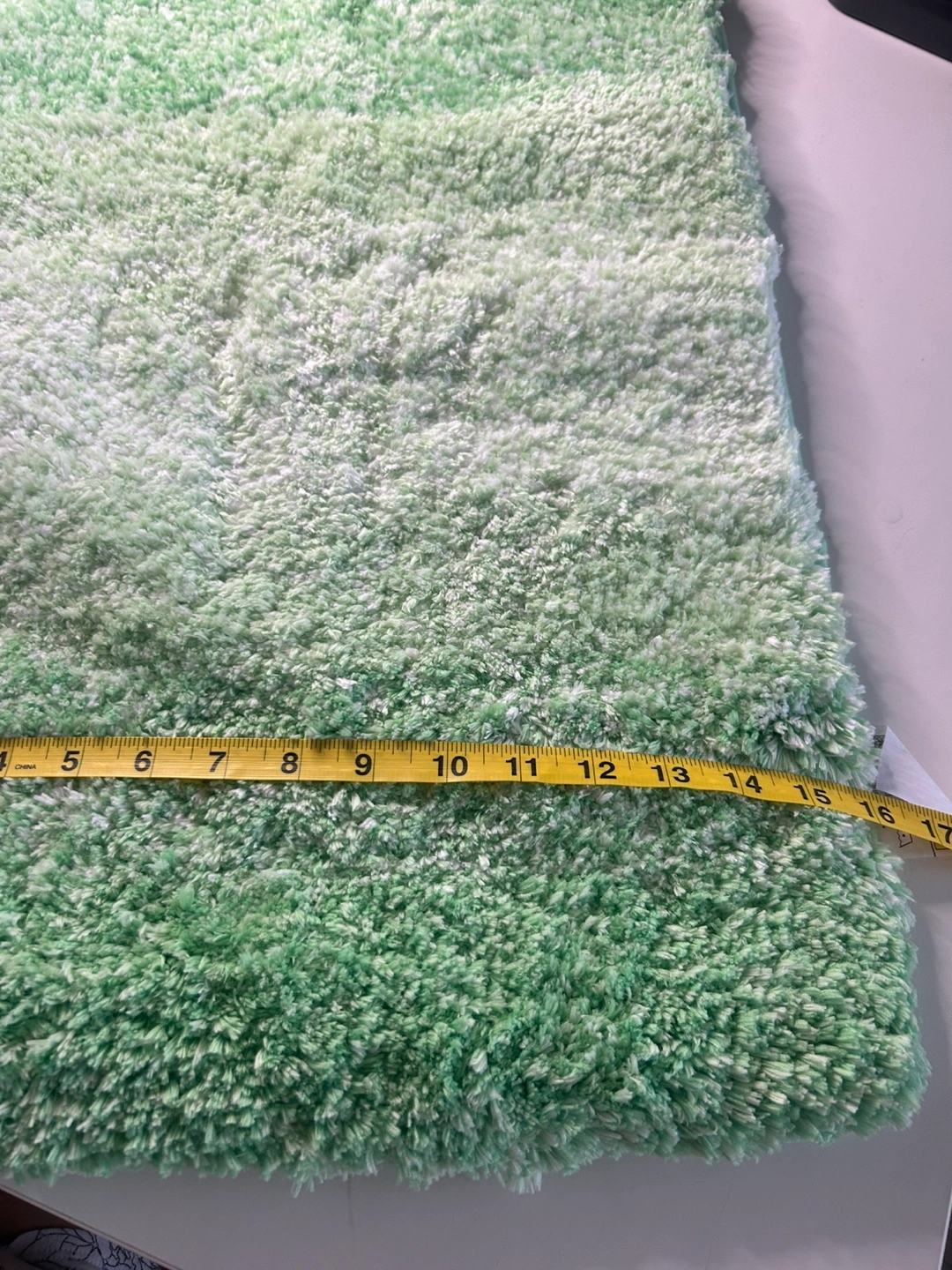 34Here's a super soft green bath mat, perfect for adding a little cozy touch to your bathroom! It measures approximately 24 inches in length and 16 inches in width. The top is 100% microfiber, and the back is thermo-plastic-rubber. It's machine washable on a cold cycle, tumble dry low, and avoid using bleach or fabric softener!