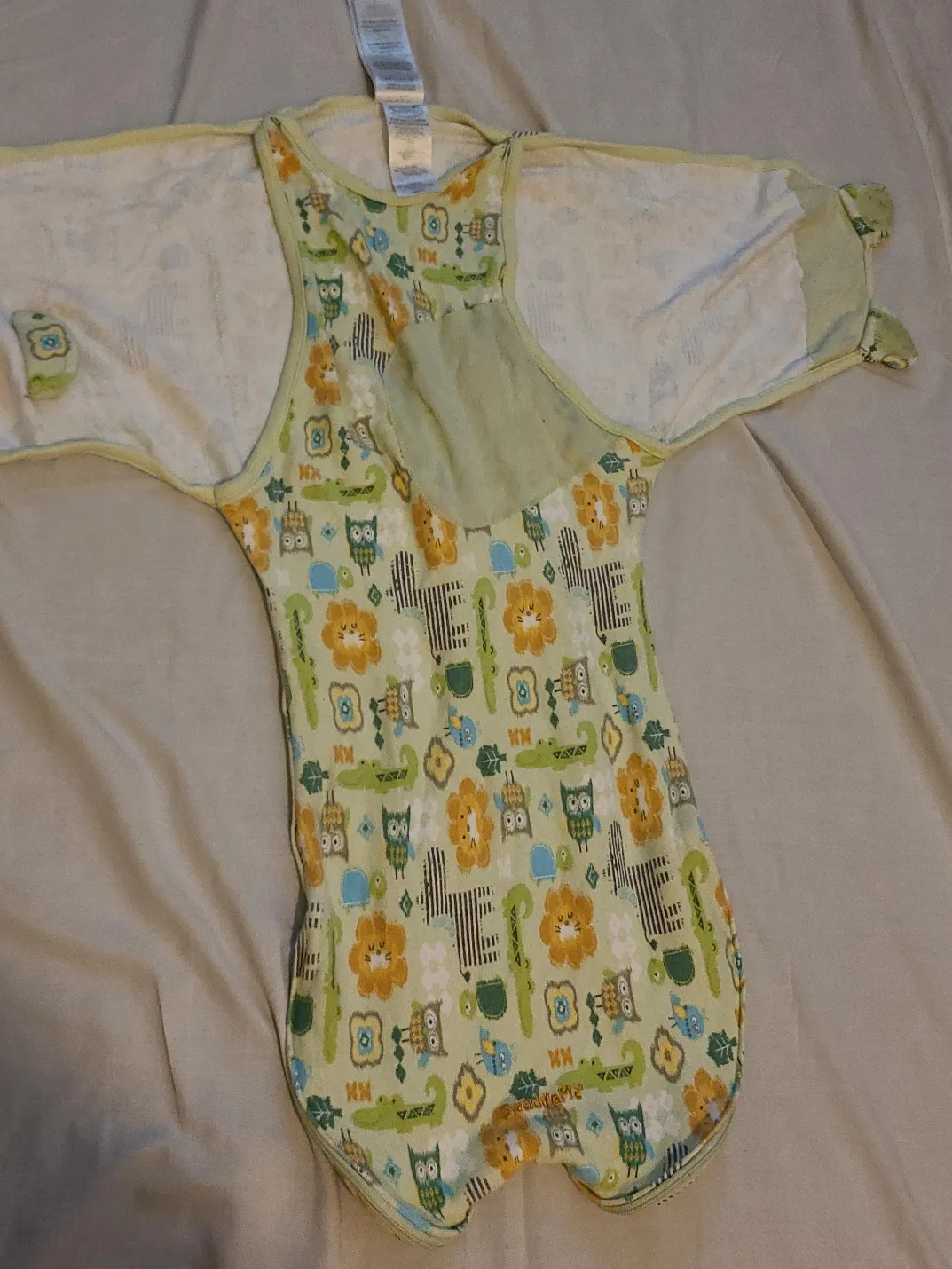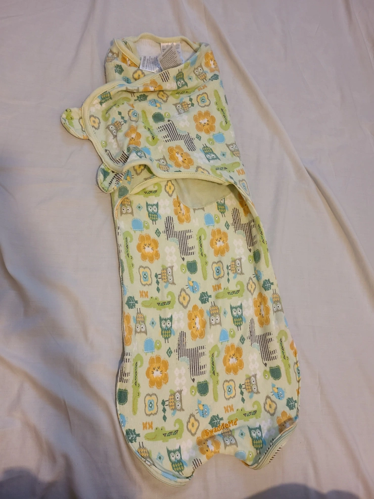 Cozy Summer Infant swaddle in a cute green animal print! It's in great condition and perfect for keeping your little one snug and secure. Velcro and shoulder snaps prevent baby from breaking out! Bottom zipper allows for diaper changes.