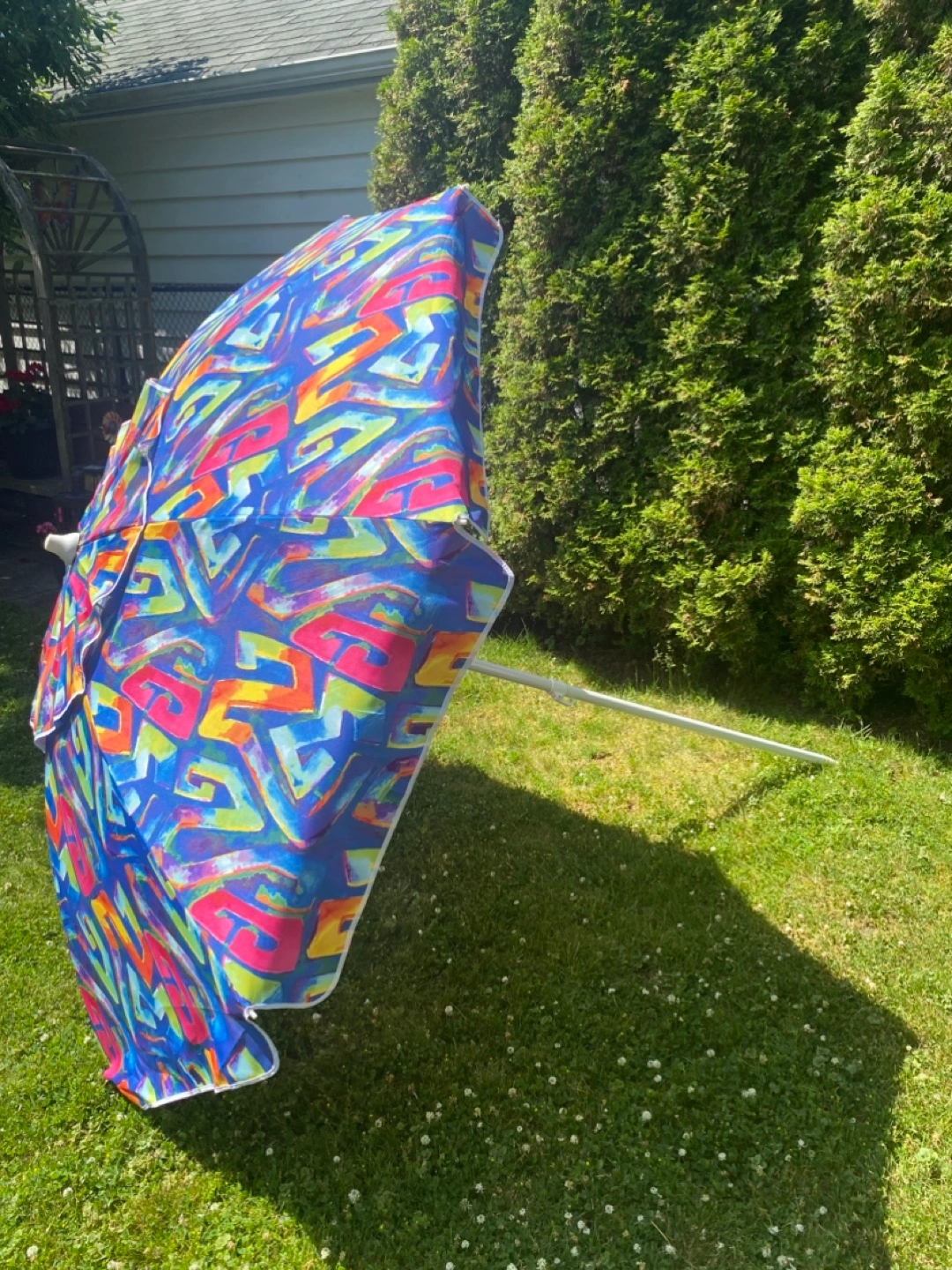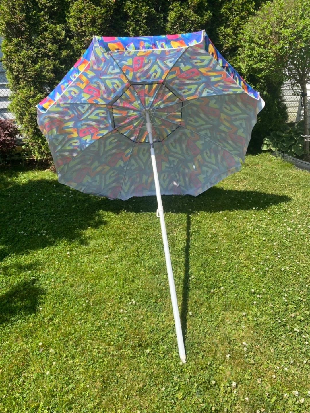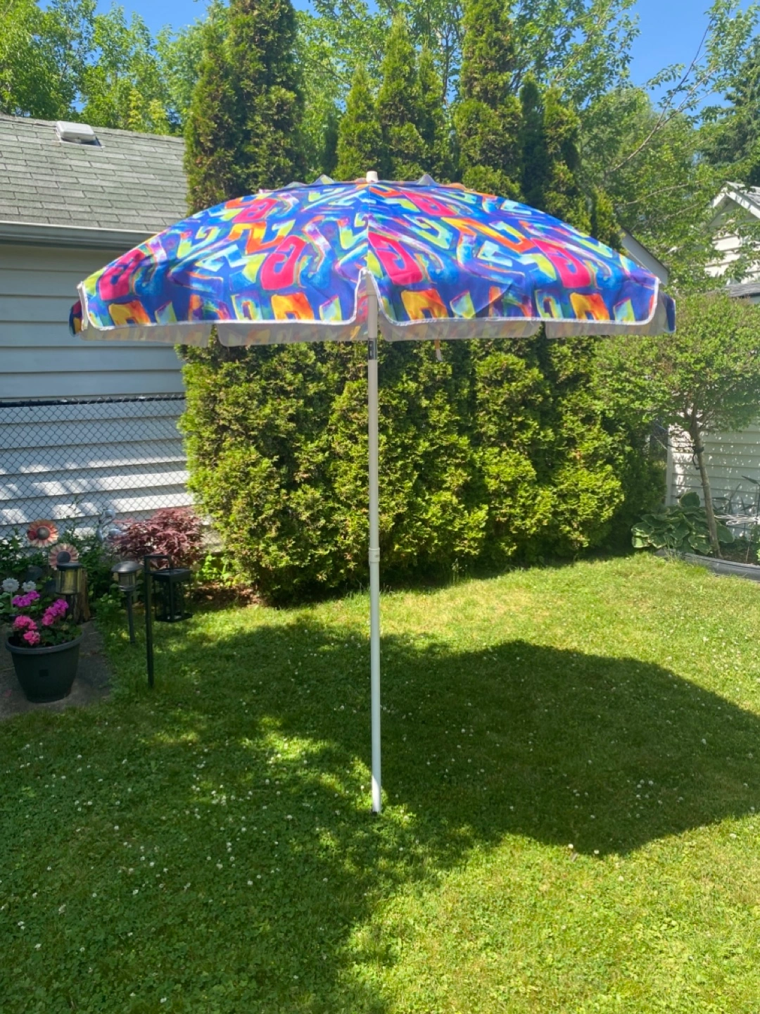 NEW! Large colourful Beach Umbrella! Measures 7 ft. with sand anchor and tilt mechanism. Push tilt button designed to adjust canopy for maximum sun protection. Unique air vented canopy designed to facilitate air flow for more stability. Vents on top of umbrella to promote air flow. Sturdy and stable frame. Sand anchor twists into sand or ground for set up. Great for the beach, camping, sports, picnics, travel, gardens etc. Never used. Excellent Condition! Cash and pick up only, Cawthra and Lakeshore area in Mississauga. No holds. Price is Firm.