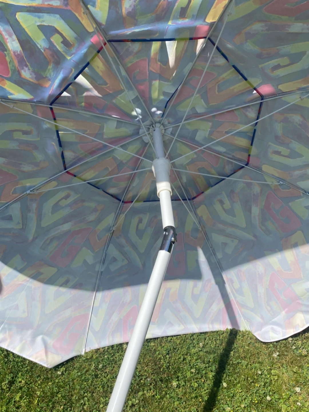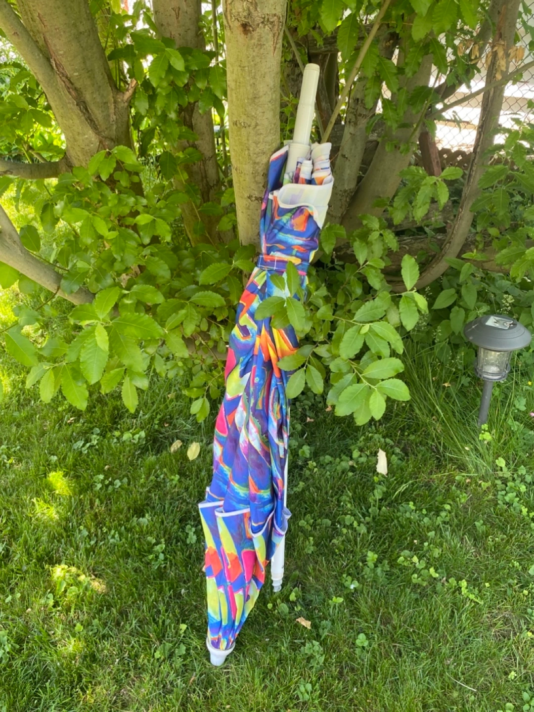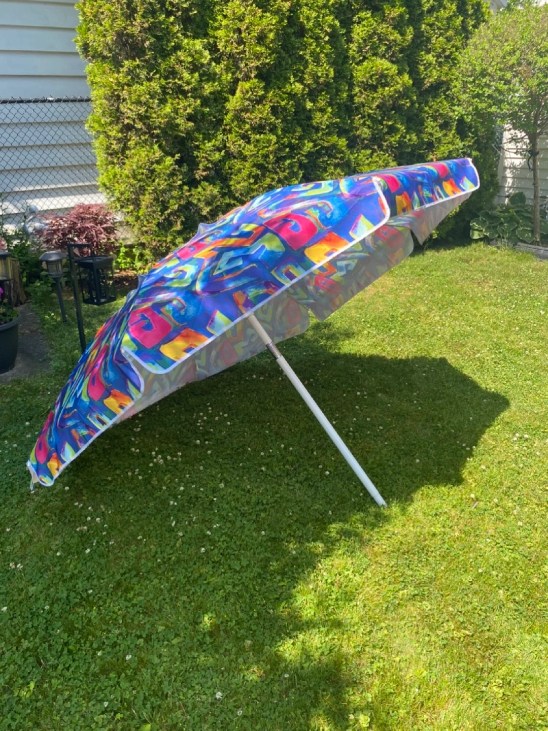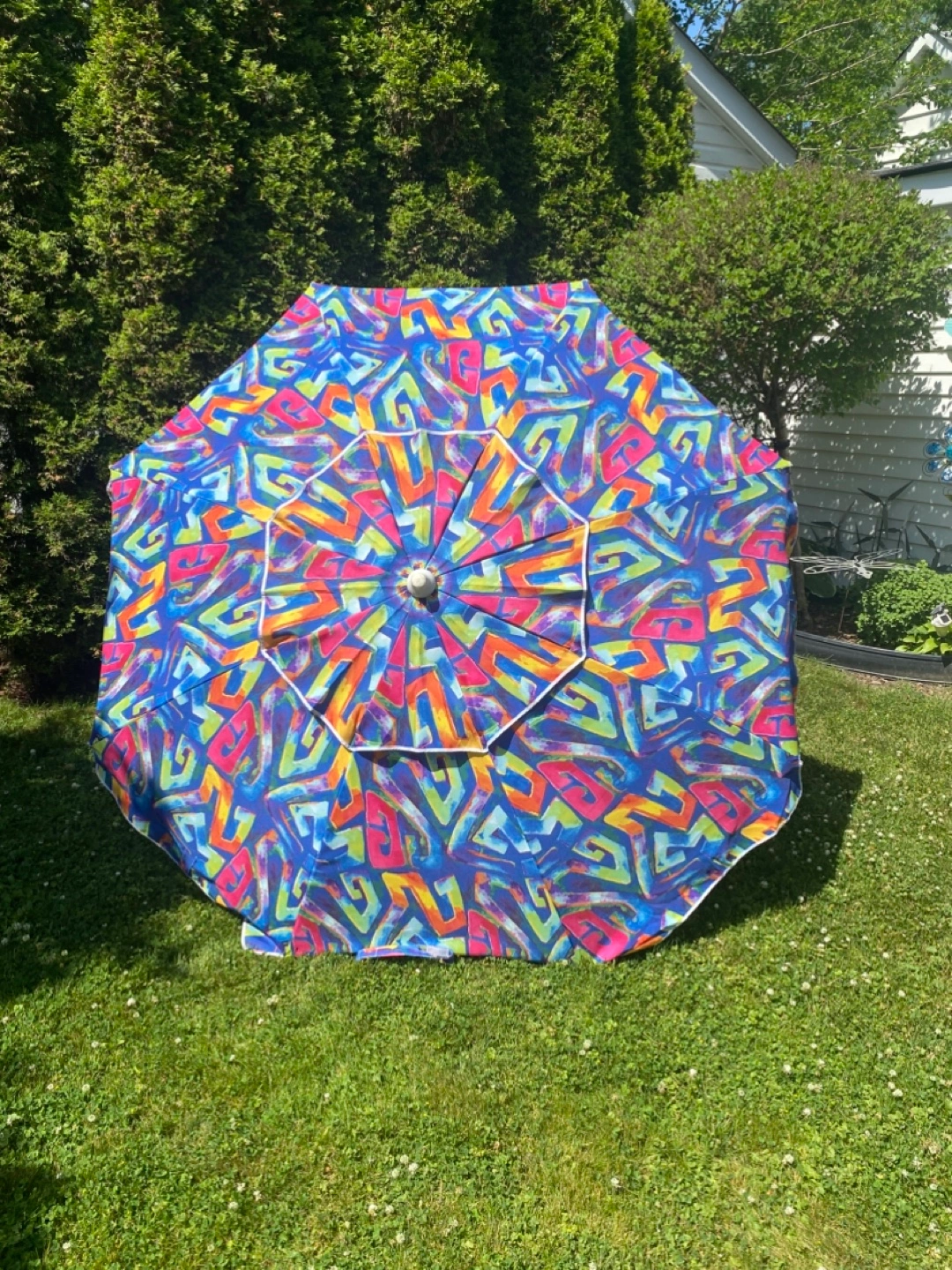 NEW! Large colourful Beach Umbrella! Measures 7 ft. with sand anchor and tilt mechanism. Push tilt button designed to adjust canopy for maximum sun protection. Unique air vented canopy designed to facilitate air flow for more stability. Vents on top of umbrella to promote air flow. Sturdy and stable frame. Sand anchor twists into sand or ground for set up. Great for the beach, camping, sports, picnics, travel, gardens etc. Never used. Excellent Condition! Cash and pick up only, Cawthra and Lakeshore area in Mississauga. No holds. Price is Firm.