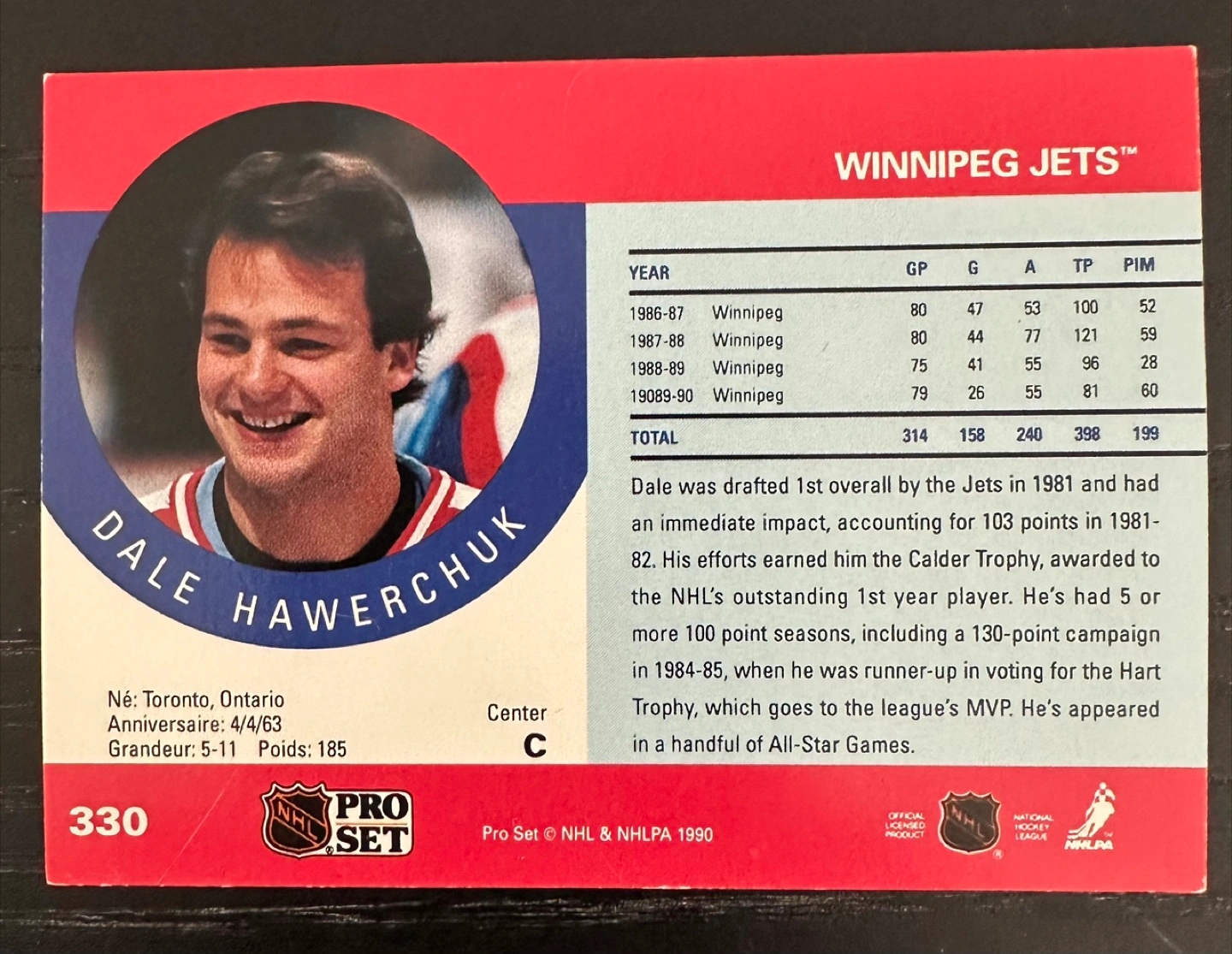 Selling a Dale Hawerchuk hockey card from the Winnipeg Jets. It's a Pro Set NHL card. Card number is 330